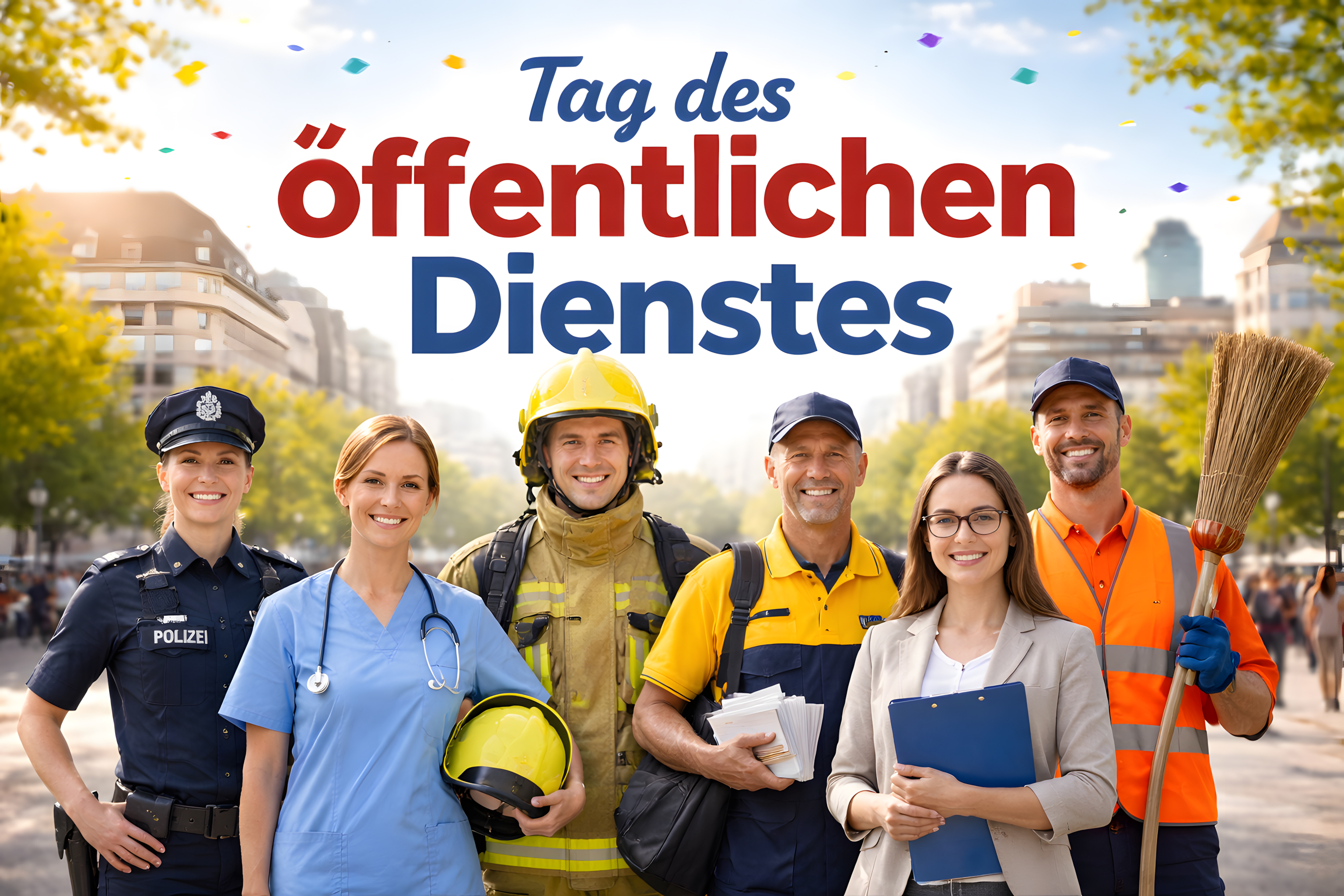 Dieses farbenprächtige Bild zeigt eine Gruppe von Menschen in unterschiedlichen Berufsuniform, die den Tag des öffentlichen Dienstes feiern. Im Vordergrund sehen wir eine Polizistin, einen Feuerwehrmann, einen Sanitäter, einen Straßenarbeiter und weitere Vertreter verschiedener Berufe des öffentlichen Sektors. Sie stehen stolz und selbstbewusst in einer Reihe, als würden sie die Vielfalt an Aufgaben und Einsatzbereichen repräsentieren, die der öffentliche Dienst umfasst.