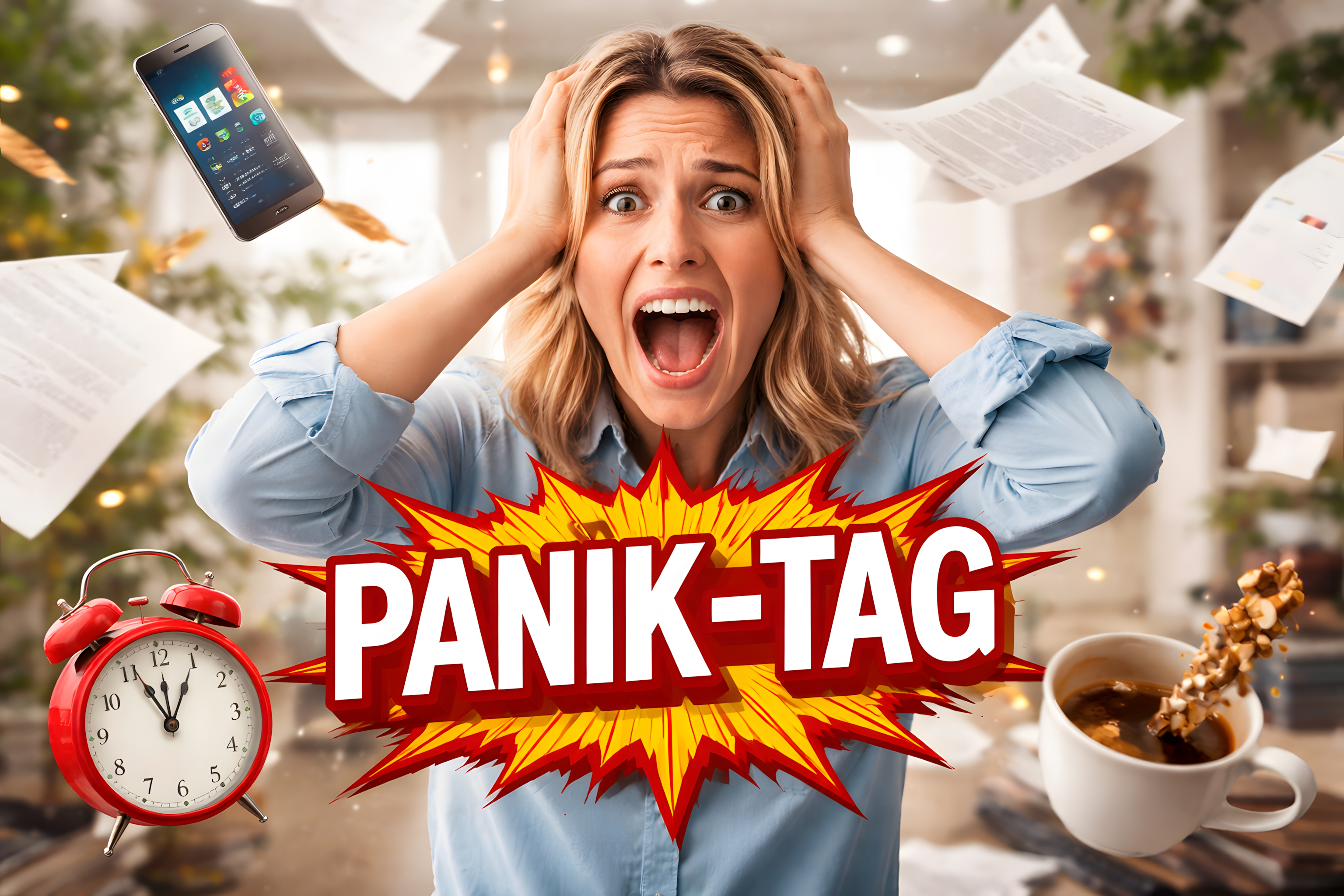 Das Bild zeigt eine junge Frau, die offensichtlich unter starkem Stress steht. Sie hält verzweifelt ihre Hände an den Kopf und schreit vor Aufregung. Um sie herum befindet sich ein chaotisches Büroumfeld mit herumliegenden Dokumenten, einem Wecker und einer dampfenden Tasse Kaffee. Das Smartphone in ihrer Hand deutet darauf hin, dass sie möglicherweise gerade von wichtigen Terminen oder Nachrichten überfordert wird.