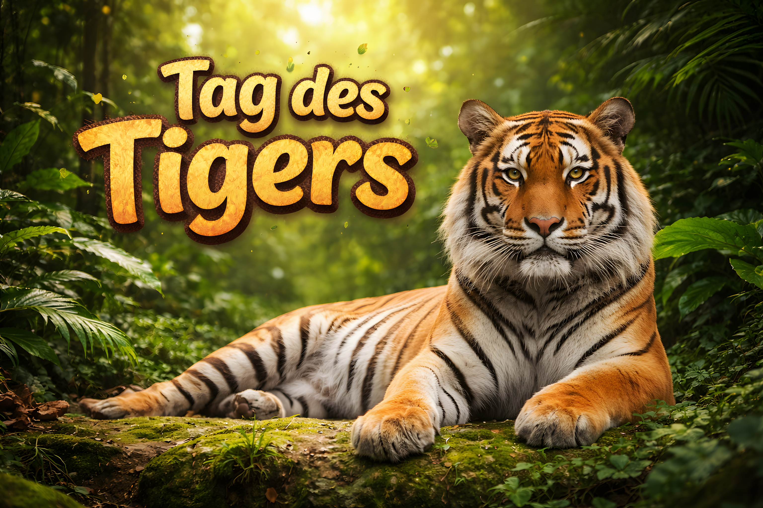 Dieses atemberaubende Foto zeigt einen majestätischen Königstiger, der ruhig in einem üppigen, grünen Regenwald liegt. Die Kamera fängt den mächtigen Raubtier in einer natürlichen, entspannten Pose ein, was seine Schönheit und Kraft perfekt zur Geltung bringt. Das sattes Orange des Fells kontrastiert wundervoll mit den smaragdgrünen Blättern und Schatten, die den Hintergrund bilden. Die Perspektive platziert den Betrachter auf Augenhöhe mit dem beeindruckenden Tier, was ein Gefühl der Nähe und Achtung vermittelt.