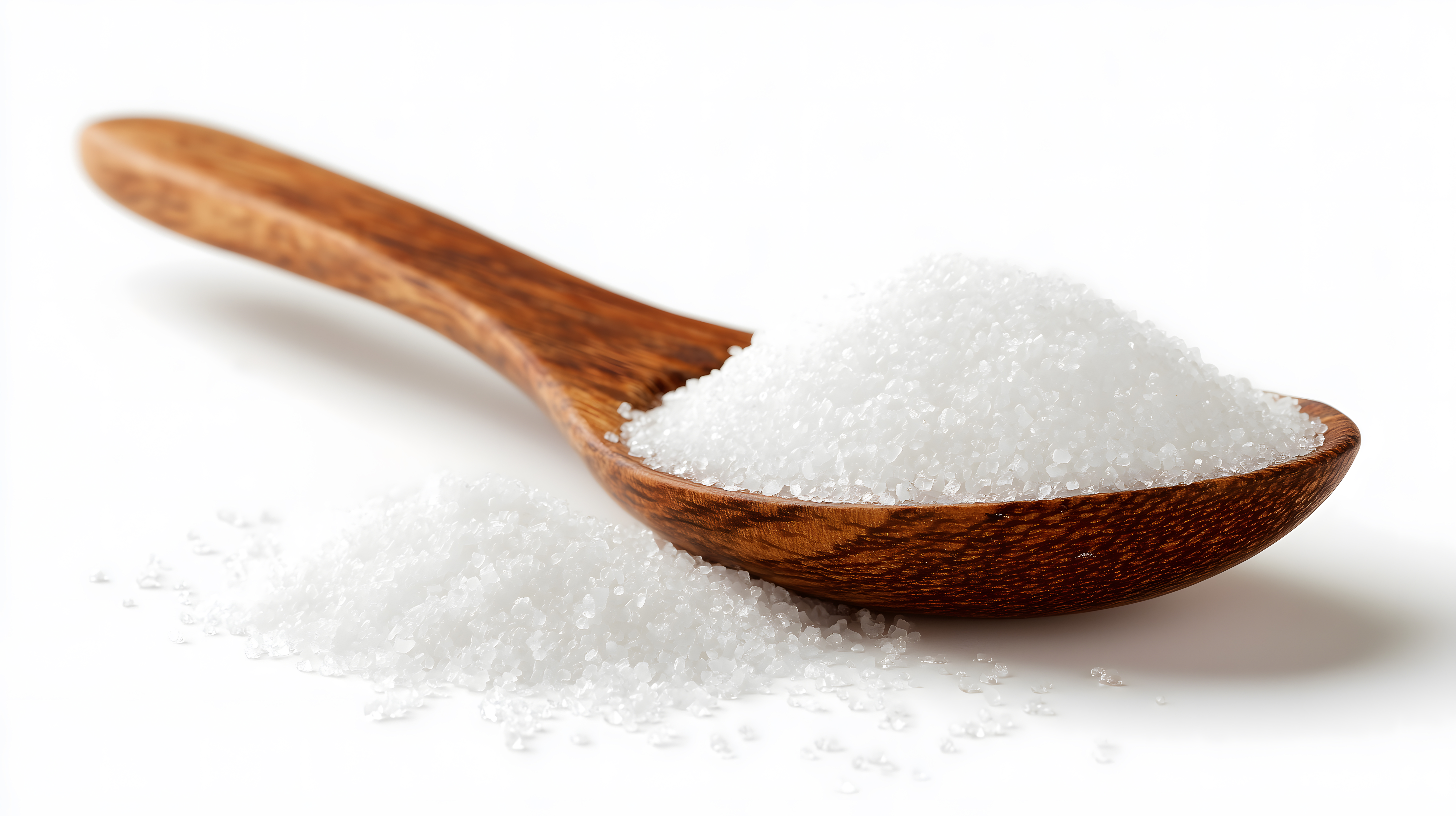 Das Bild zeigt eine detaillierte Nahaufnahme eines hölzernen Löffels, der mit feinem, weißem Meersalz gefüllt ist. Der Kontrast zwischen dem warmen, glänzenden Holz des Löffels und den glitzernden, kristallinen Salzkristallen ist sehr ästhetisch. Die Draufsicht-Perspektive und die scharfe Fokussierung auf das Salz lenken die Aufmerksamkeit des Betrachters direkt auf das Hauptmotiv.