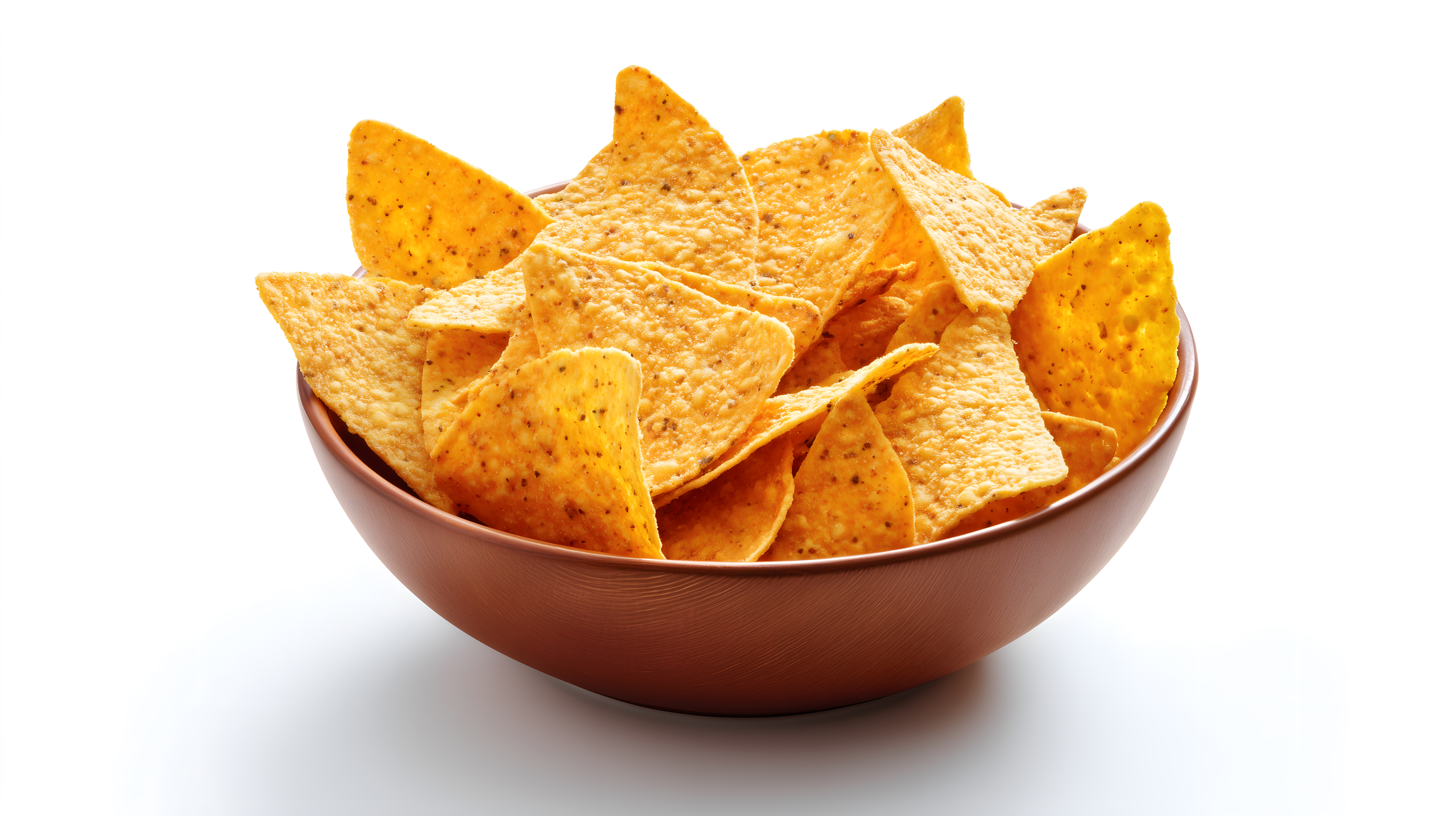 Das Bild zeigt eine Schüssel voller knuspriger, orange-gelber Nachos-Chips. Die Chips sind in einer leicht erhöhten Perspektive aufgenommen, wodurch die Textur und Knusprigkeit besonders gut zur Geltung kommt. Die Farbpalette ist warm und appetitanregend, dominiert von den kräftigen Orangetönen der Chips.