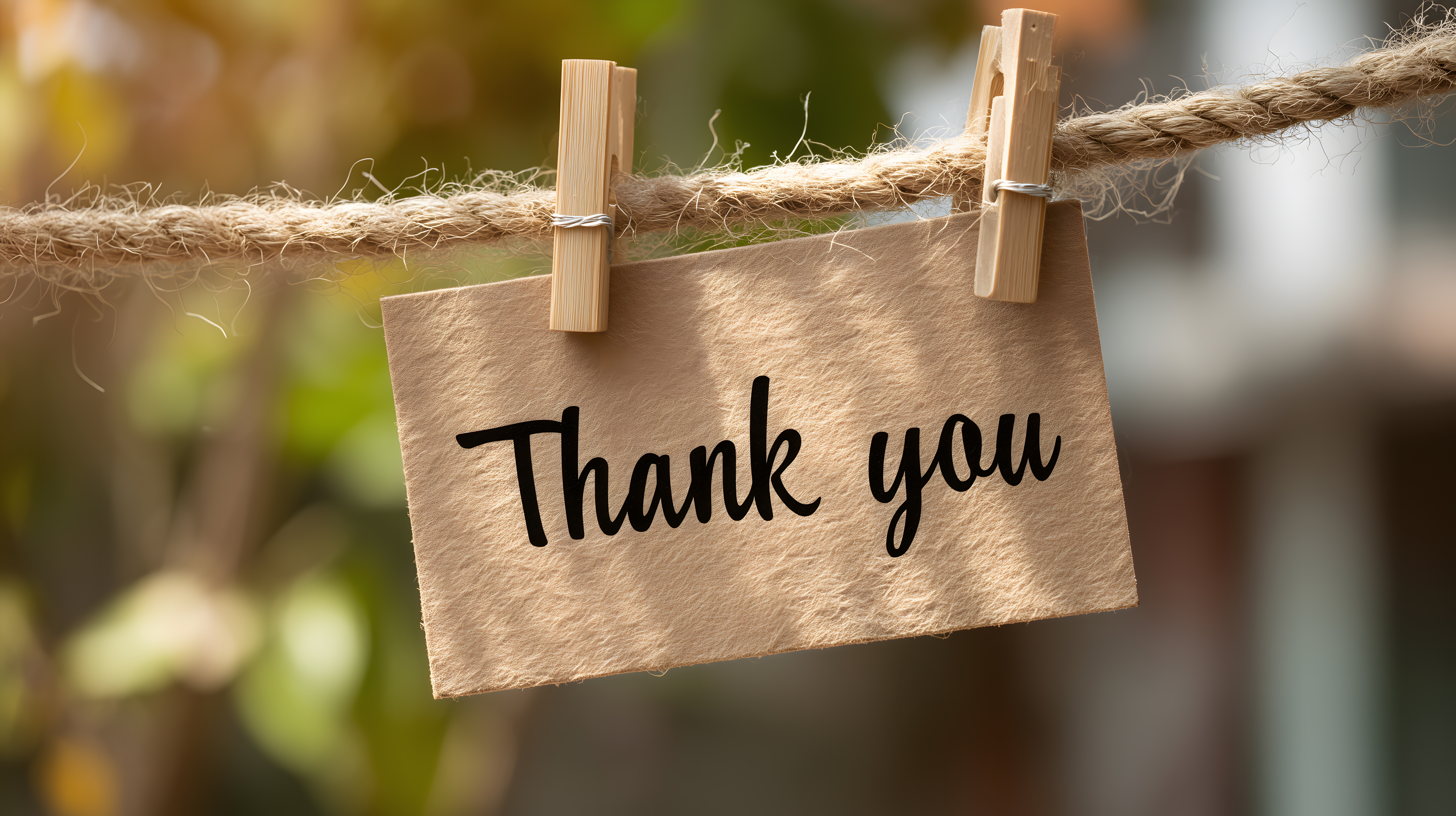 Das Bild zeigt eine handgeschriebene Danksagung, die an einer Wäscheleine hängt. Die Nachricht ist auf einem braunen Pergamentpapier geschrieben und mit einfachen Wäscheklammern an der Leine befestigt. Der Hintergrund ist unscharf, aber man erkennt eine grünliche, natürliche Umgebung, die einen ruhigen und friedlichen Eindruck vermittelt.