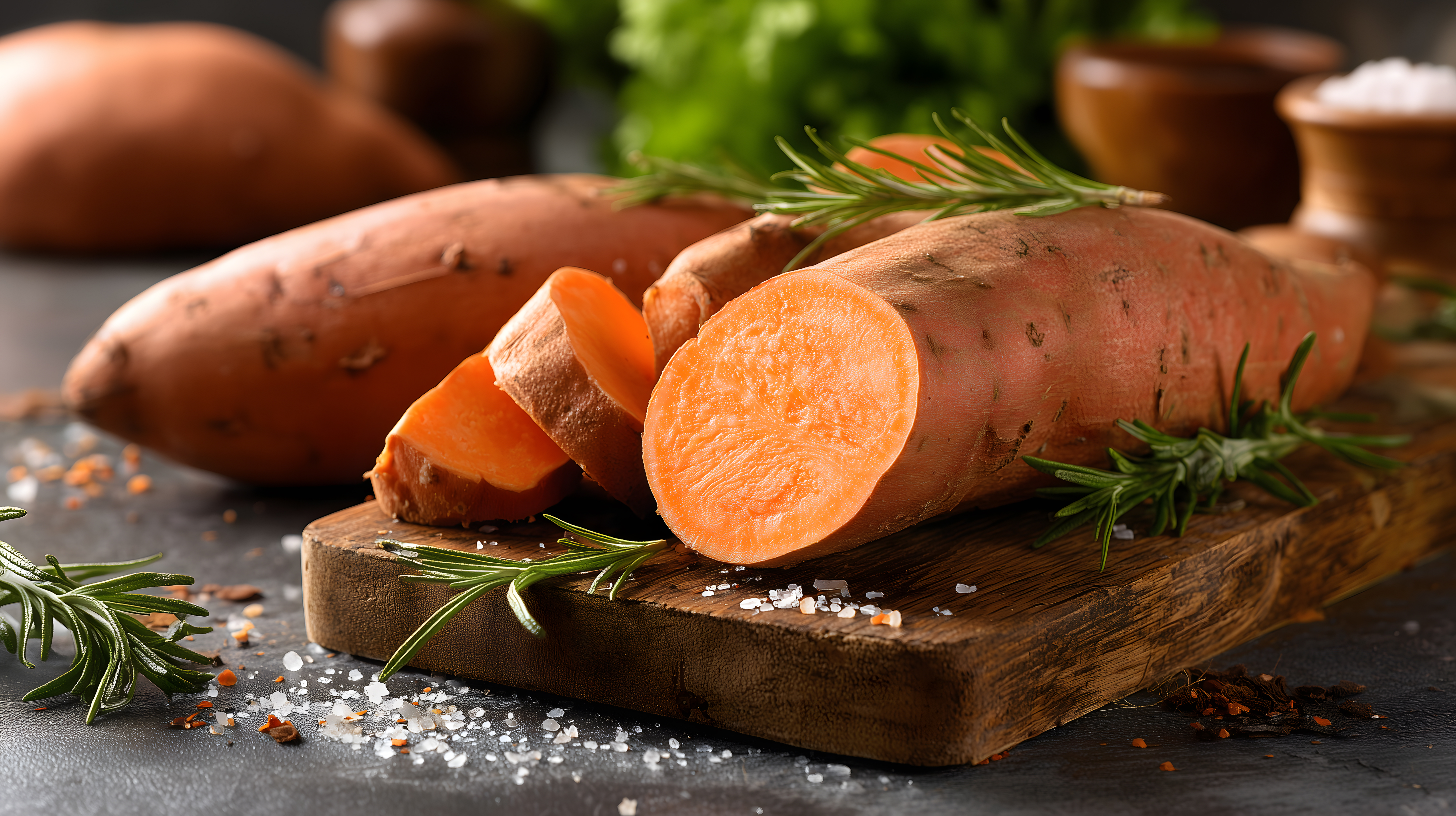 Das Foto zeigt eine Nahaufnahme von mehreren Süßkartoffeln auf einem rustikalen Holzbrett. Die Kartoffeln sind in verschiedene Scheiben geschnitten und mit frischem Rosmarin und Meersalz garniert. Die Farbpalette ist warm und erdtönig, mit kräftigem Orange, Braun und Grün. Die Komposition ist symmetrisch und fokussiert sich auf die Süßkartoffeln als Hauptmotiv.