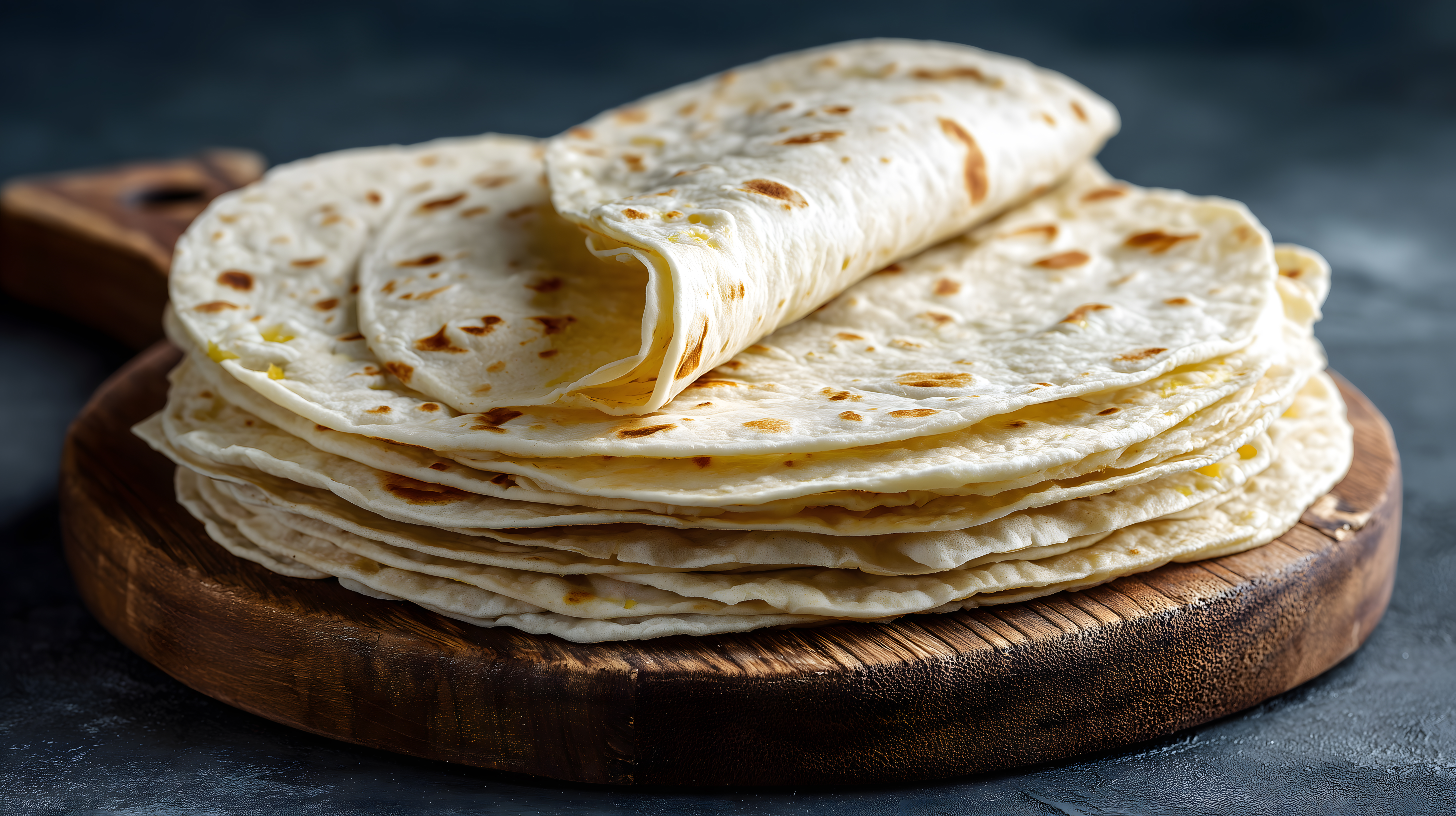 Das Bild zeigt eine Reihe von frisch gebackenen, goldfarbenen Tortillas auf einem Holzbrett vor einem dunklen Hintergrund. Die Tortillas sind leicht gebogen und übereinander gestapelt, sodass man ihre Textur und Beschaffenheit deutlich erkennen kann. Die Nahaufnahme und die dunkle Hintergrundfarbe lassen die Tortillas im Vordergrund klar hervortreten.