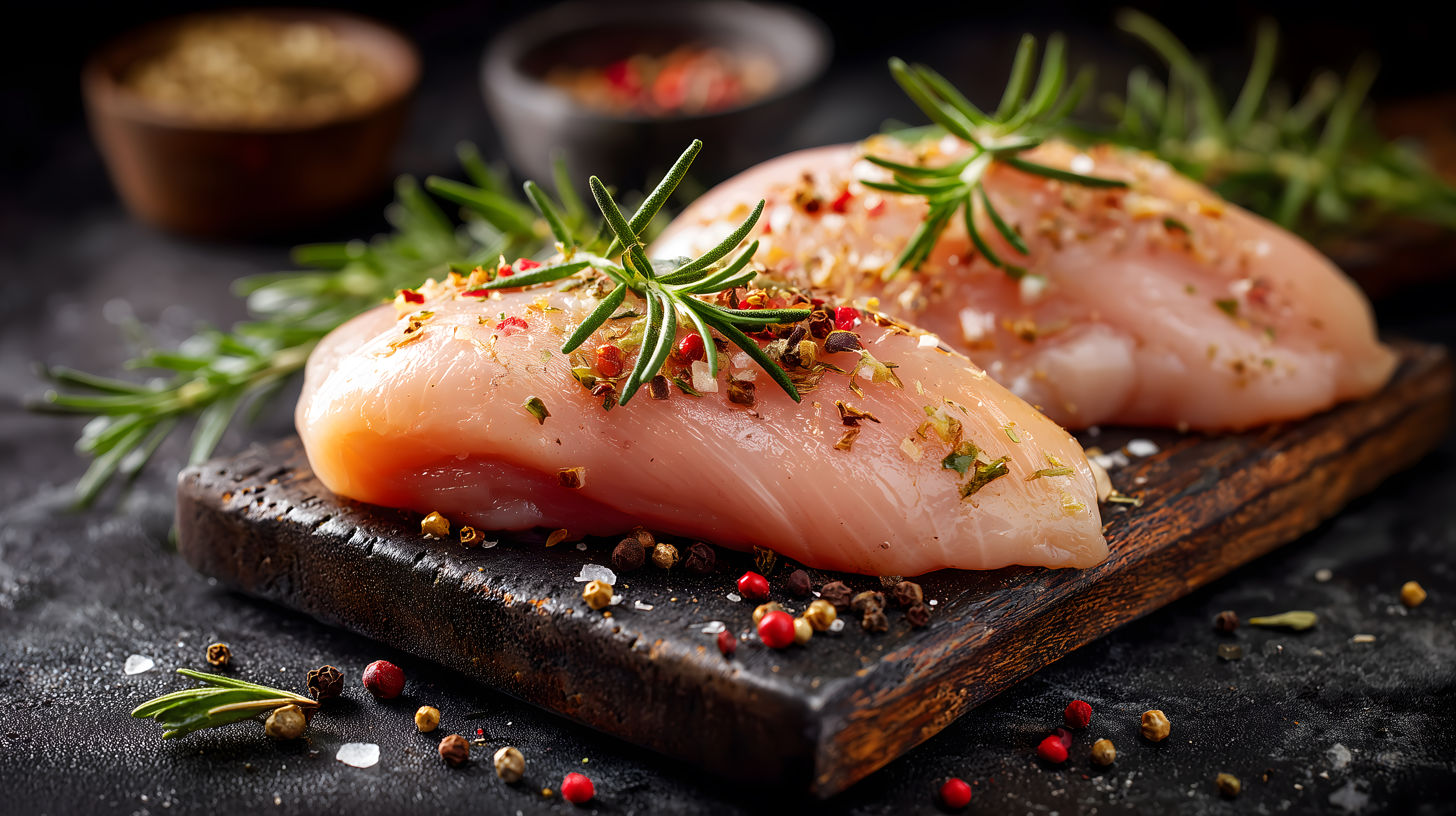 Das Bild zeigt eine Nahaufnahme von saftigen, rohen Hähnchenfilets, die auf einem dunklen Holzbrett angerichtet sind. Die Hähnchenstücke sind mit frischen Rosmarin-Zweigen und einer Mischung aus verschiedenen Gewürzen wie Pfeffer und Paprika dekoriert, was der Aufnahme ein appetitliches und authentisches Erscheinungsbild verleiht.
