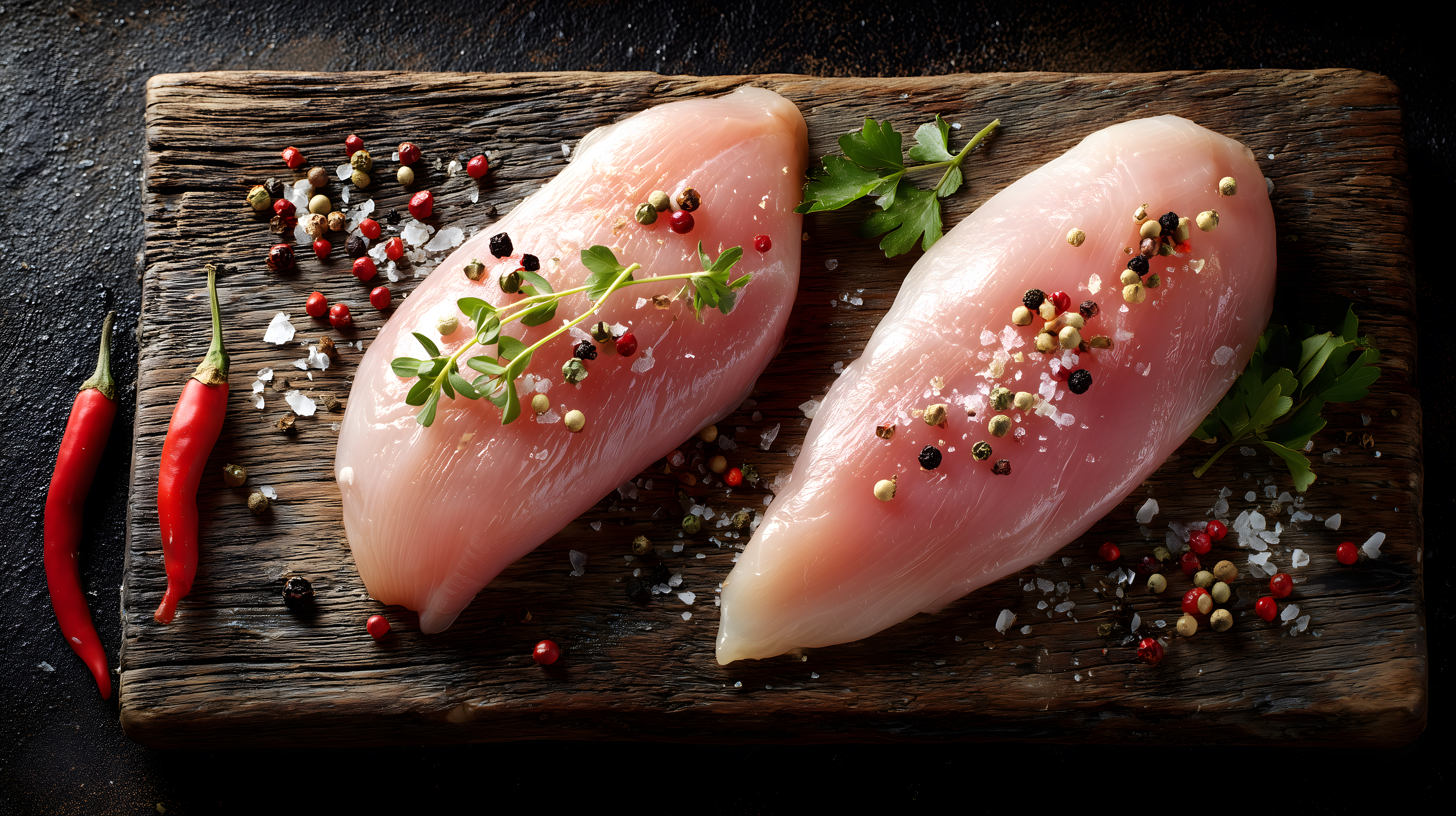 Das Bild zeigt eine Draufsicht auf zwei frische Hähnchenfilets, die auf einem dunklen Holzbrett angerichtet sind. Die Filets sind umgeben von verschiedenen Gewürzen wie Pfefferkörner, Chilischoten und Petersilie, die eine appetitliche Optik und einen würzigen Geschmack versprechen. Das Foto ist in einer dunklen, minimalistischen Farbpalette gehalten, die den Fokus auf die Hauptzutaten lenkt und eine hochwertige, professionelle Anmutung vermittelt.