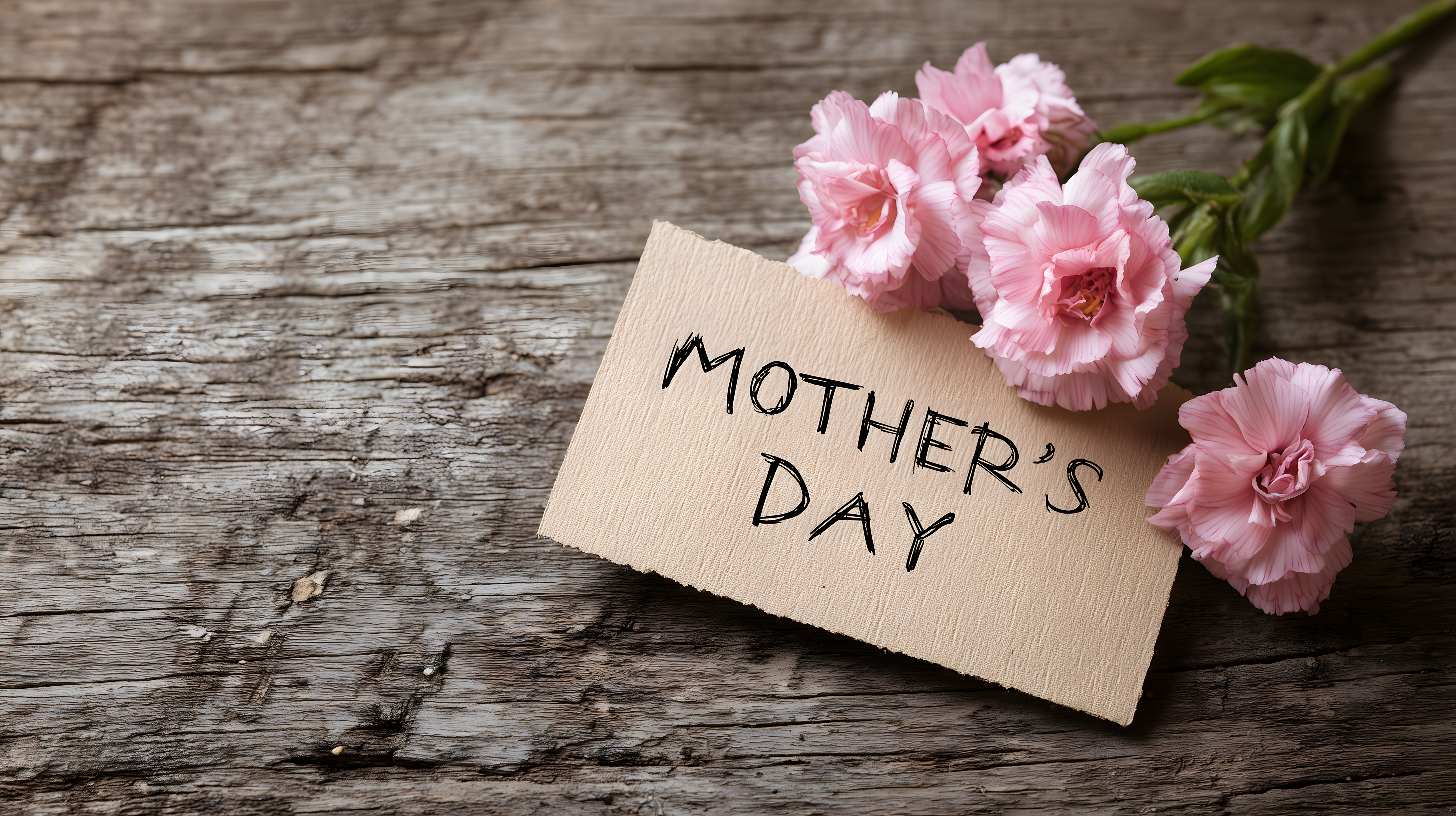 Das Foto zeigt eine Draufsicht auf ein rustikales, hölzernes Hintergrundbild, das mit rosa Nelkenblüten umrahmt ist. Auf einem Papierfragment in der Mitte steht in Handschrift der Text "Mother's Day". Die Farbpalette des Fotos ist natürlich und erdtönig, mit den rosa Blüten als Kontrast. Die Komposition lenkt den Blick direkt auf die zentrale Botschaft, die durch die Platzierung und Beleuchtung der Blumen hervorgehoben wird.