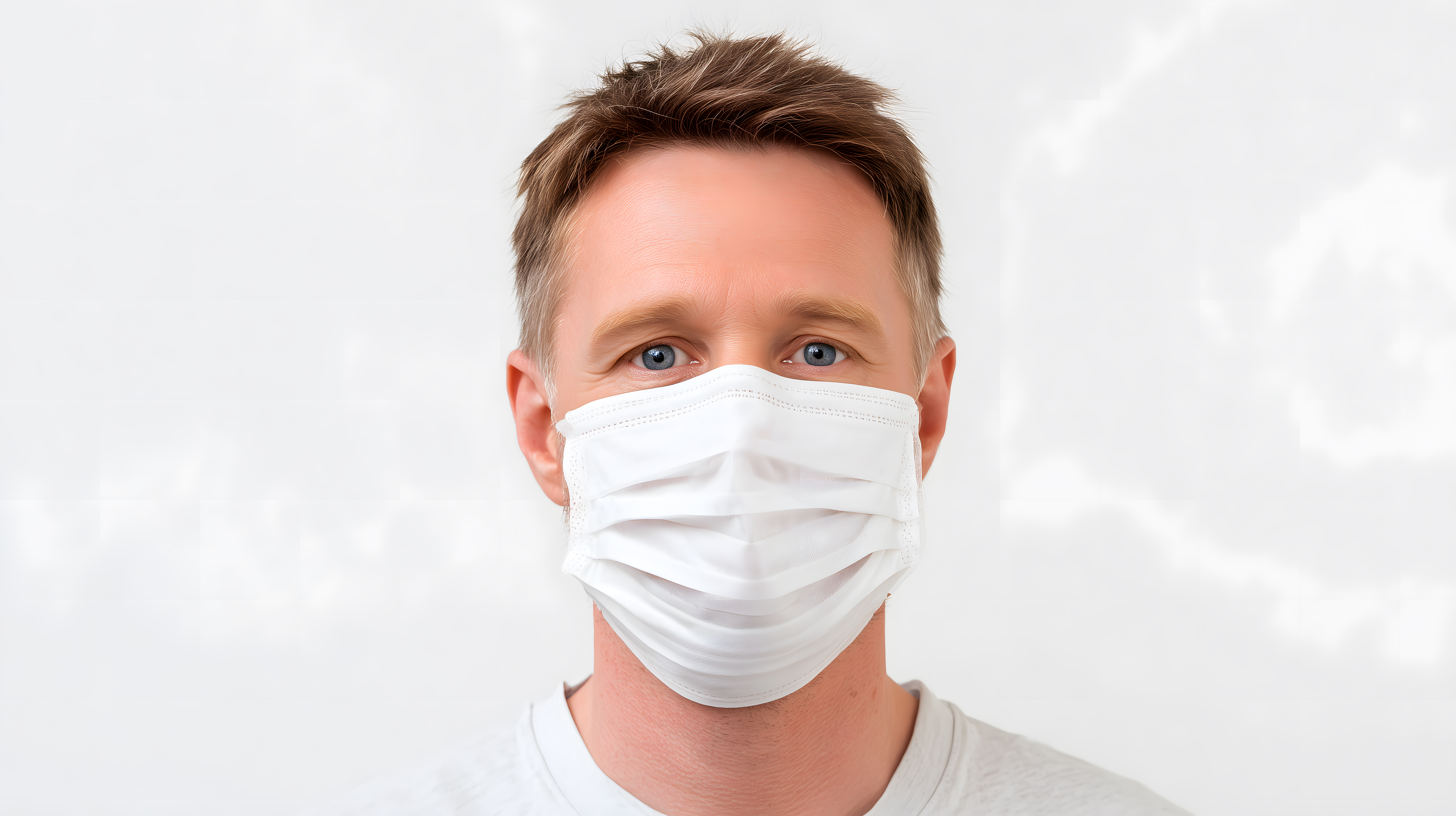 Das Foto zeigt eine Nahaufnahme eines Mannes, der eine weiße medizinische Gesichtsmaske trägt. Die Maske bedeckt den unteren Teil des Gesichts, während die blauen Augen des Mannes deutlich sichtbar sind. Der neutrale Hintergrund lenkt den Blick ganz auf das Gesicht und betont die Bedeutung der Schutzmaßnahme.