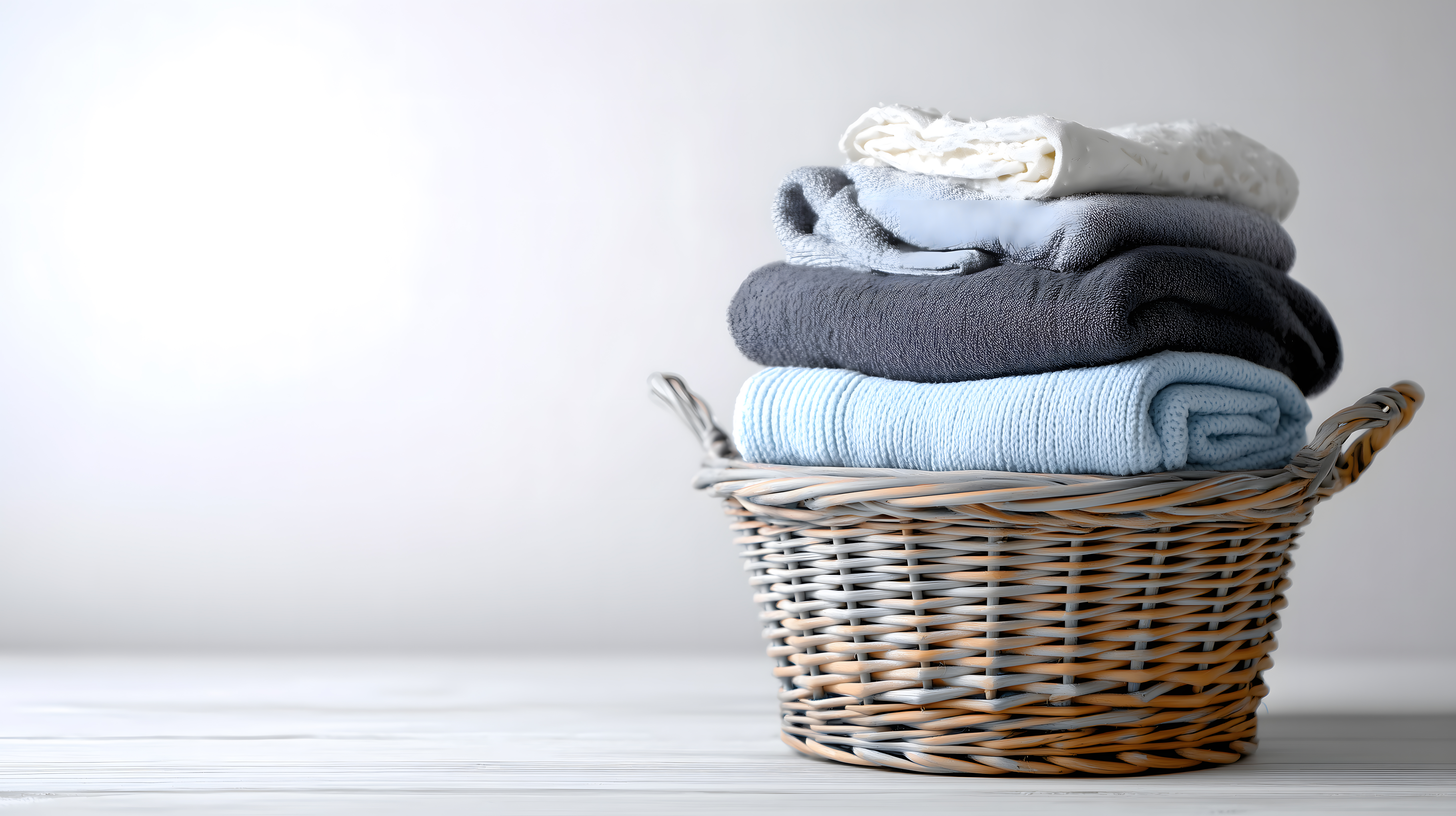 Die Draufsicht-Perspektive und die scharfe Fokussierung auf den Korb lenken die Aufmerksamkeit des Betrachters direkt auf die sauberen, ordentlich gefalteten Handtücher. Das Bild könnte ideal für Blogbeiträge, Newsletter oder Social-Media-Posts zum Thema Haushaltsorganisation, Reinigung oder Textilien verwendet werden.