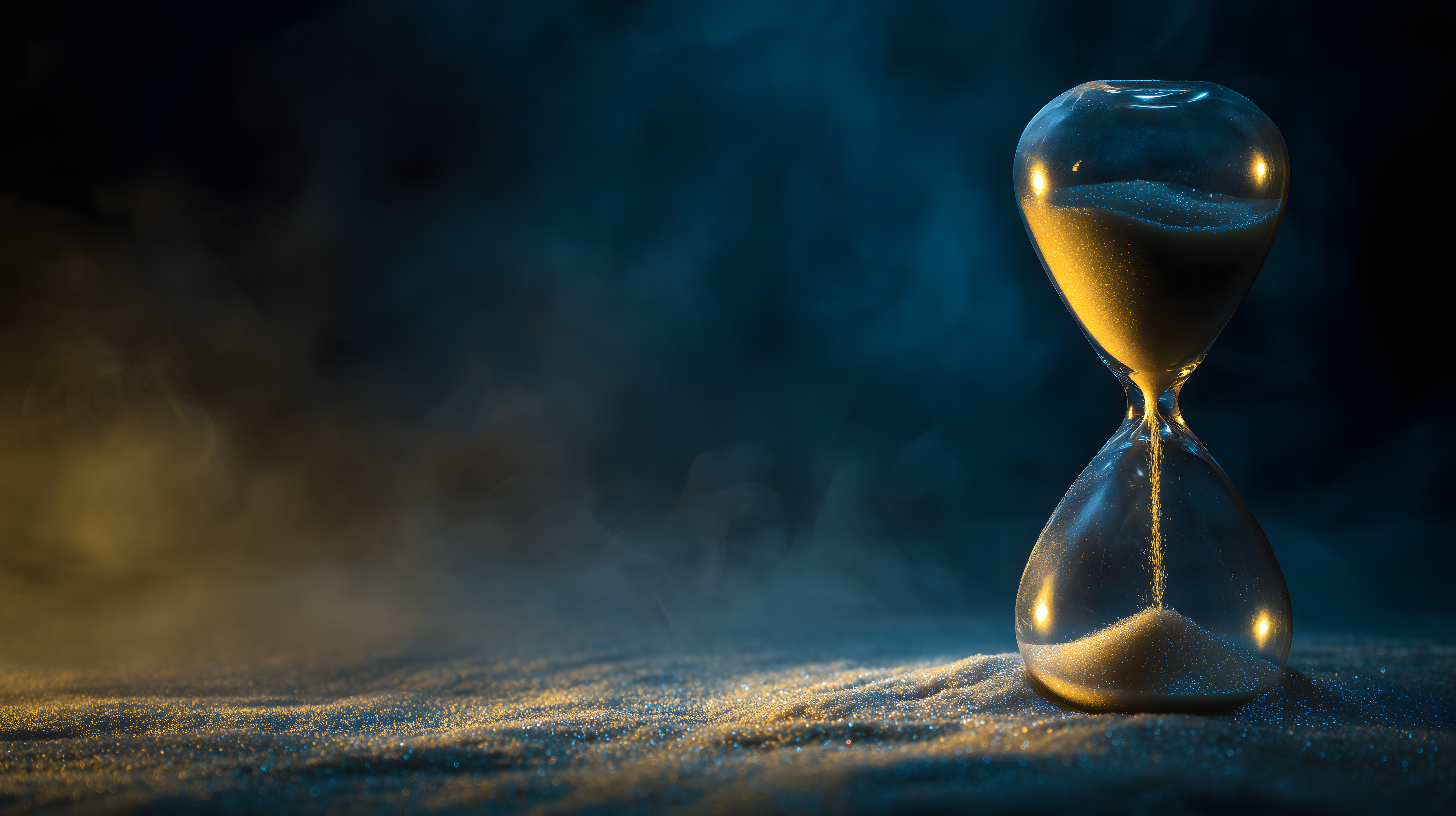 Die Komposition ist ausgewogen und hebt das zentrale Objekt der Sanduhr hervor. Der Blickwinkel ist leicht erhöht, wodurch der Betrachter das Objekt von oben herab betrachtet. Diese Perspektive verleiht dem Bild eine besondere Tiefenwirkung und Prägnanz. Die Farbpalette ist auf Blautöne und Gelbtöne beschränkt, was dem Bild eine stimmungsvolle und harmonische Ästhetik verleiht.