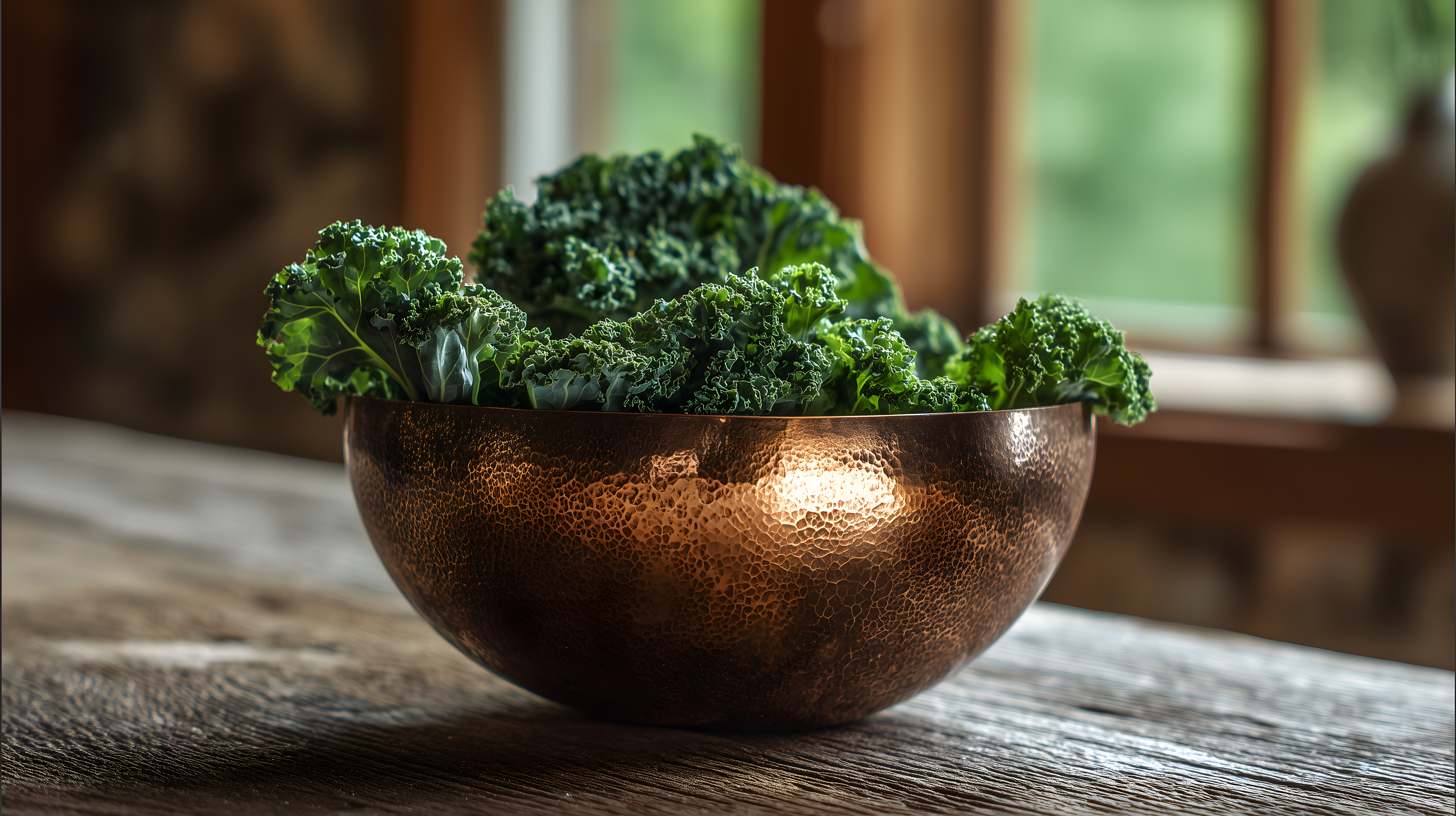 Das Bild zeigt eine Nahaufnahme einer Schüssel voller grüner Blätter - Grünkohl oder Ähnliches. Die Schüssel ist aus poliertem, kupferglänzendem Metall und steht auf einem Holztisch. Der Hintergrund ist etwas verschwommen, aber man erkennt Fenster, die einen Blick auf eine natürliche, grüne Umgebung erlauben.