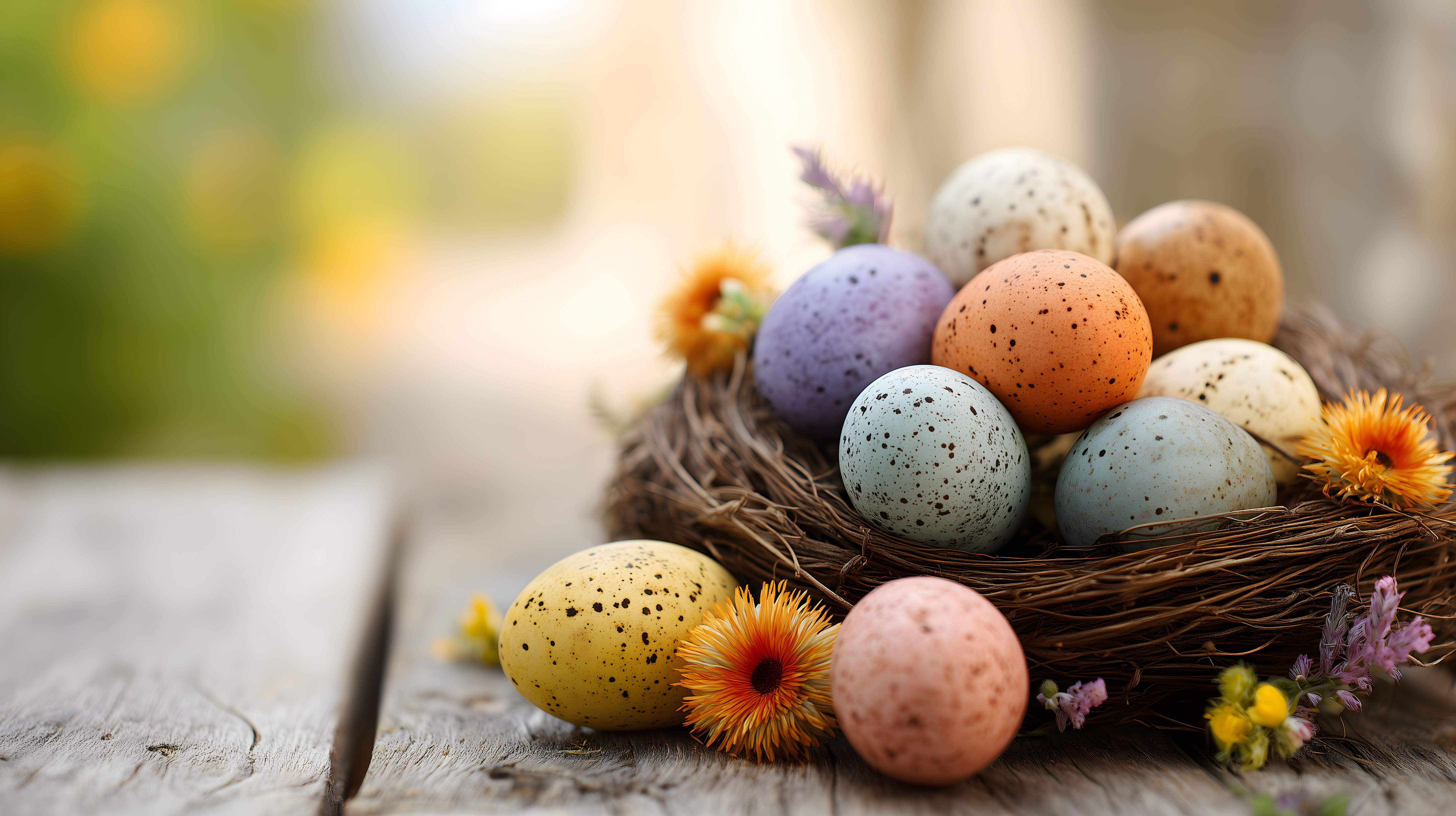 Das Bild zeigt eine Nahaufnahme eines Osternests mit bunten, getupften Eiern in verschiedenen Pastelltönen wie Blau, Orange und Beige. Das Nest ist aus Zweigen geflochten und befindet sich auf einem hölzernen Untergrund. Umgeben sind die Eier von gelben und orangefarbenen Blüten, die einen frischen und natürlichen Eindruck vermitteln.