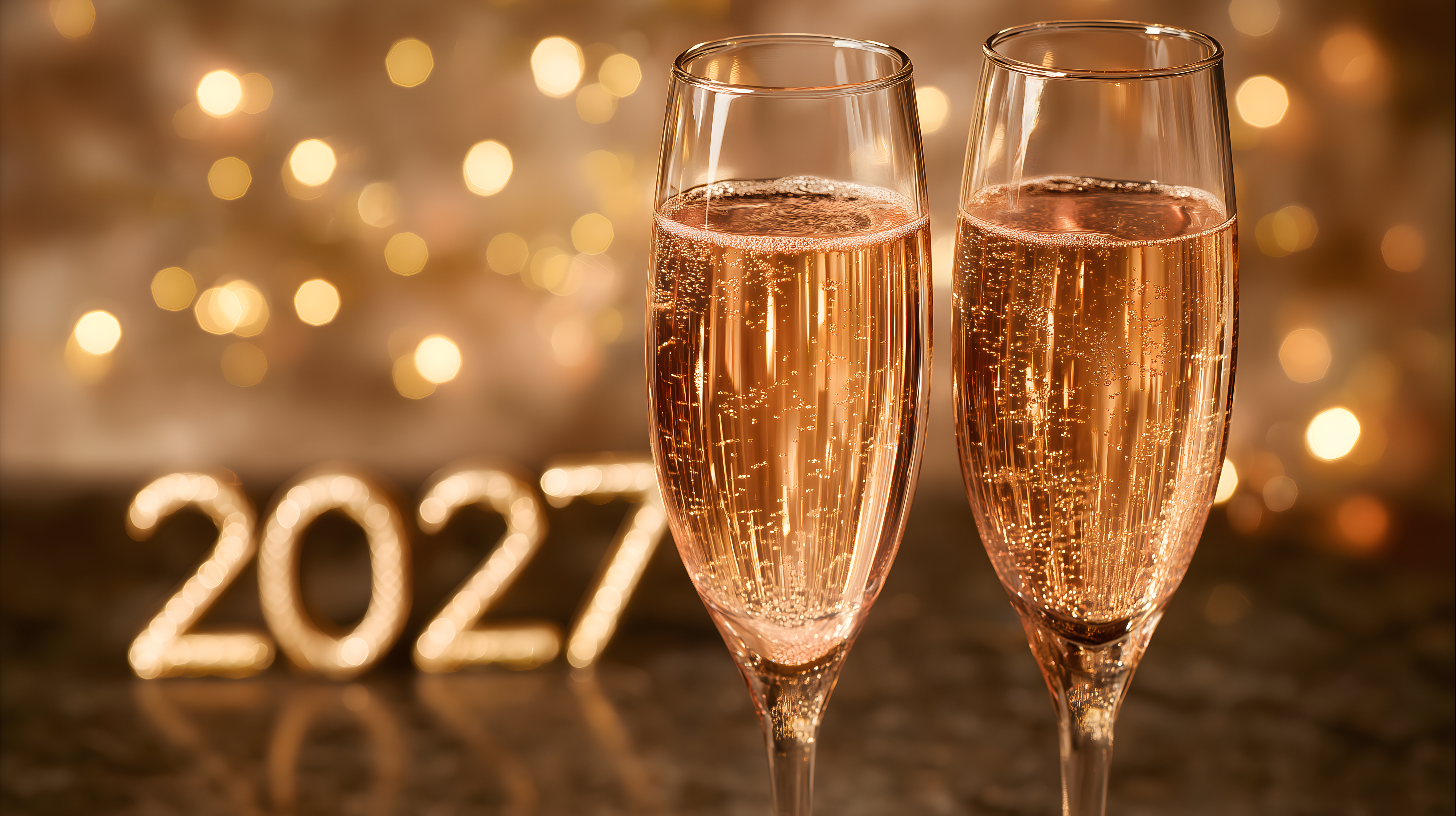 Das Bild zeigt zwei gefüllte Champagnergläser auf einem glitzernden Hintergrund. Die Gläser sind mit goldenem, sprudelndem Champagner gefüllt und werfen einen warmen, goldenen Schein auf die Umgebung. Im Vordergrund sind die Zahlen "2027" zu sehen, die vermutlich das neue Jahr symbolisieren sollen. Die Komposition ist ausgewogen und die Perspektive legt den Fokus auf die Champagnergläser als Hauptmotiv.