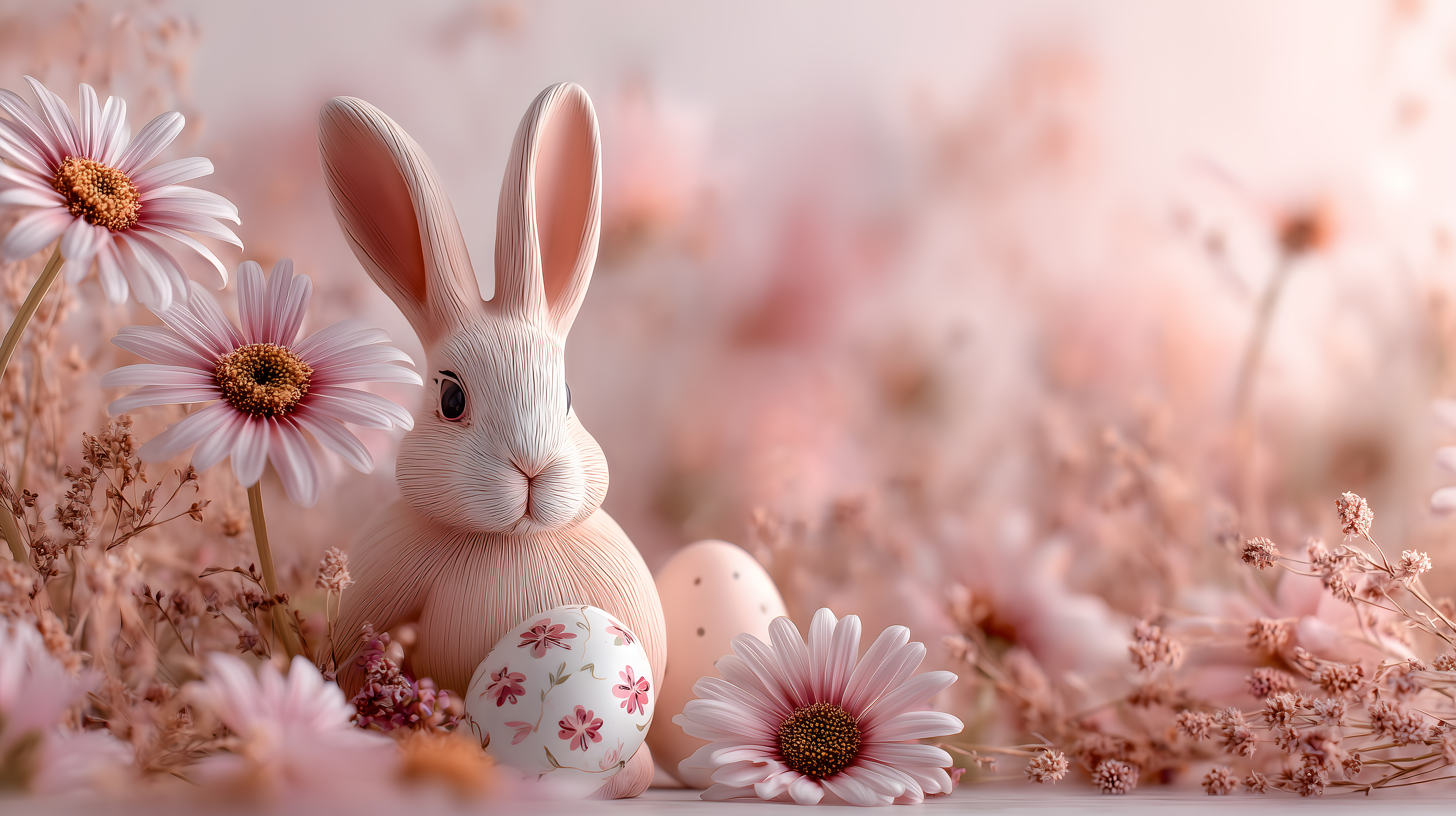 Das Bild zeigt eine romantische Szene mit einem süßen Osterhasen, umgeben von zarten Gänseblümchen in hellen, warmen Farbtönen. Die Kameraperspektive ist eine Draufsicht, die das Motiv in einer detaillierten Nahaufnahme präsentiert. Die Farbpalette ist sehr harmonisch und sanft, dominiert von Pastelltönen von Rosa, Weiß und Beige, was eine friedliche und märchenhafte Atmosphäre schafft.