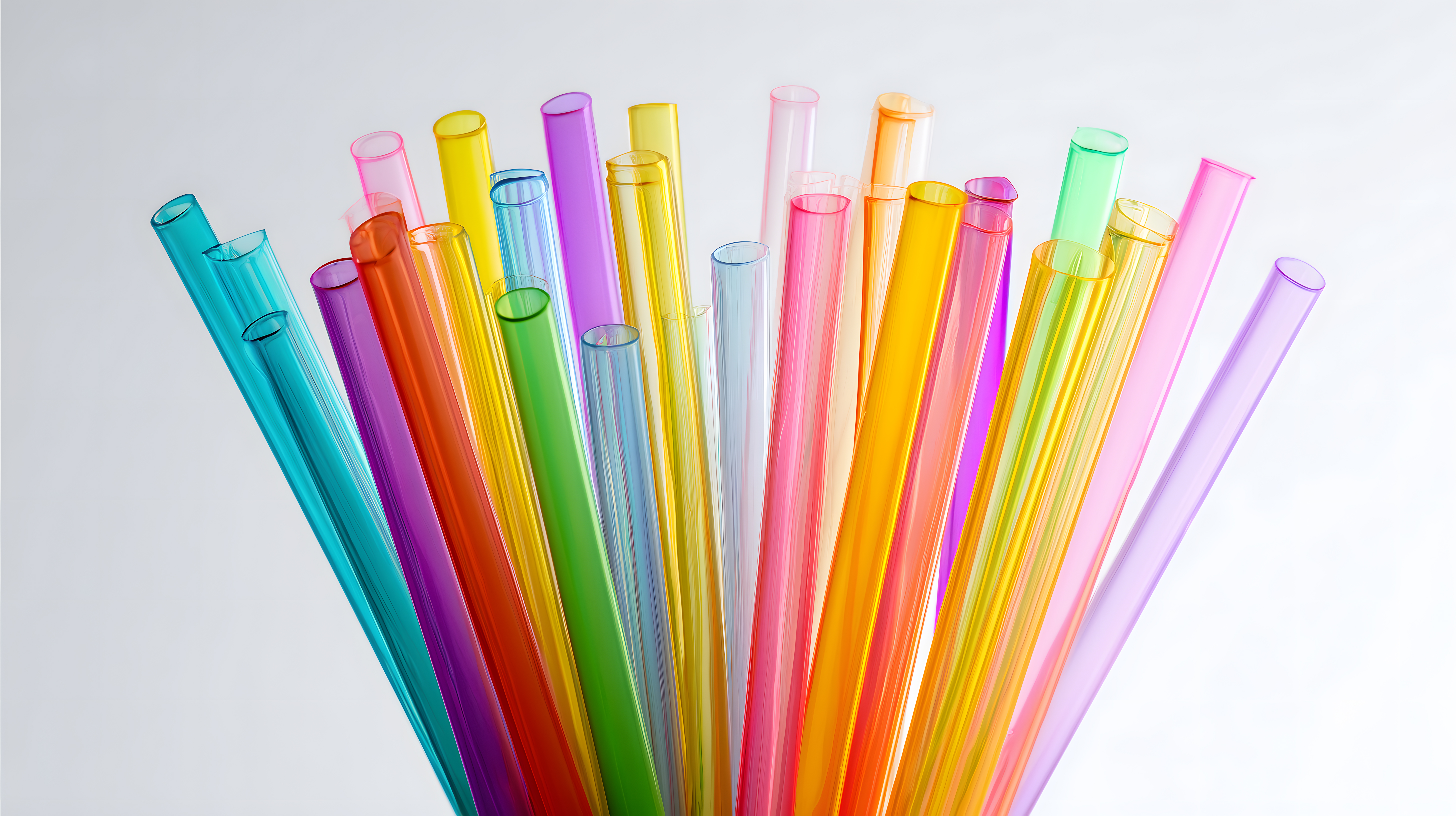 Das Bild zeigt eine Vielzahl an farbenfrohen Glasröhren, die in unterschiedlichen Größen, Längen und Farbtönen angeordnet sind. Die Röhren reichen von kräftigen Farbtönen wie Orange und Gelb bis hin zu sanfteren Pastelltönen wie Türkis und Lila. Die Komposition hat eine klare Struktur und verleiht dem Bild eine ästhetische Anmutung.