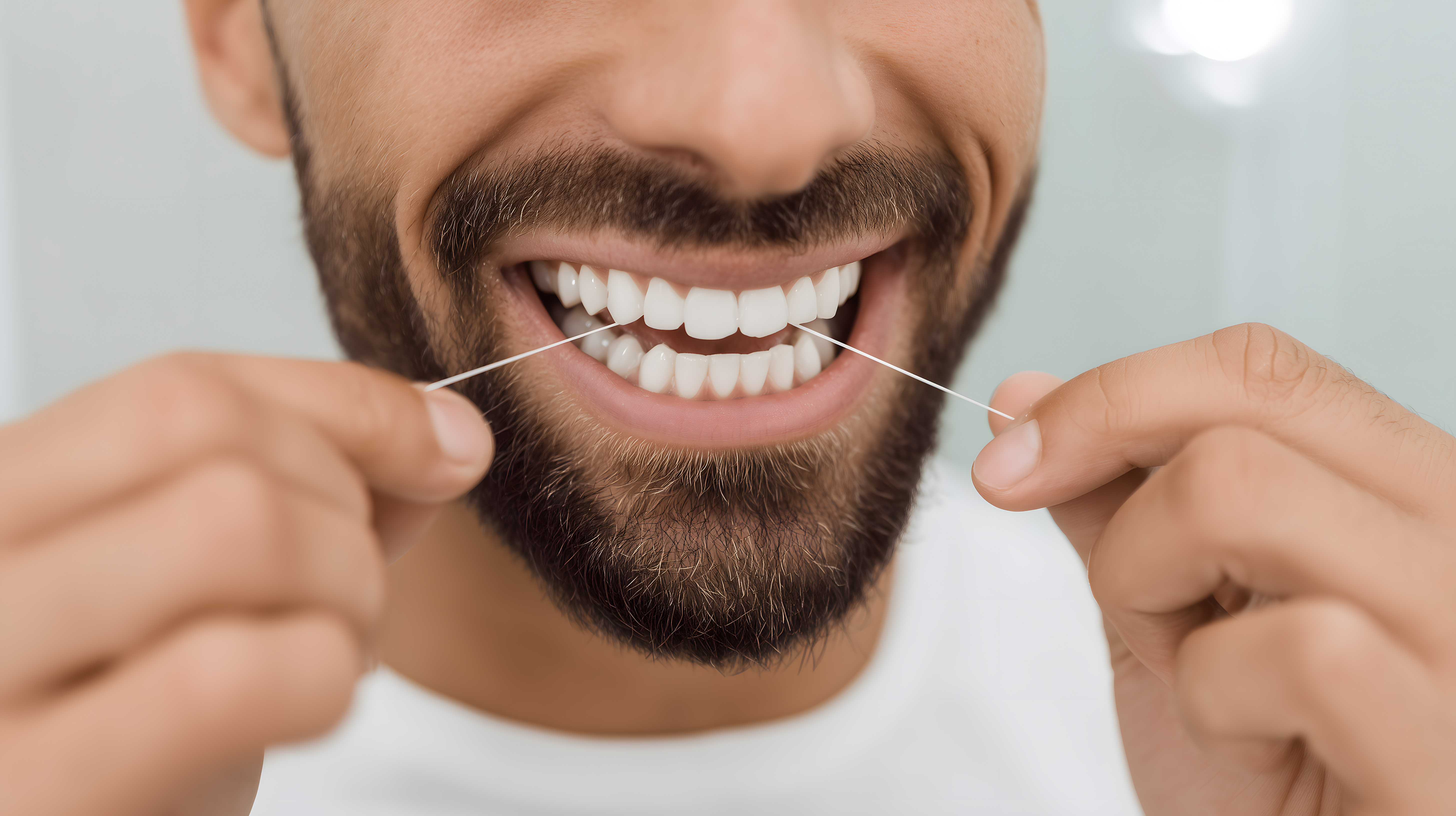 Mann reinigt weiße Zähne mit Zahnseide aus nächster Nähe von Marco Verch unter Creative Commons 4.0