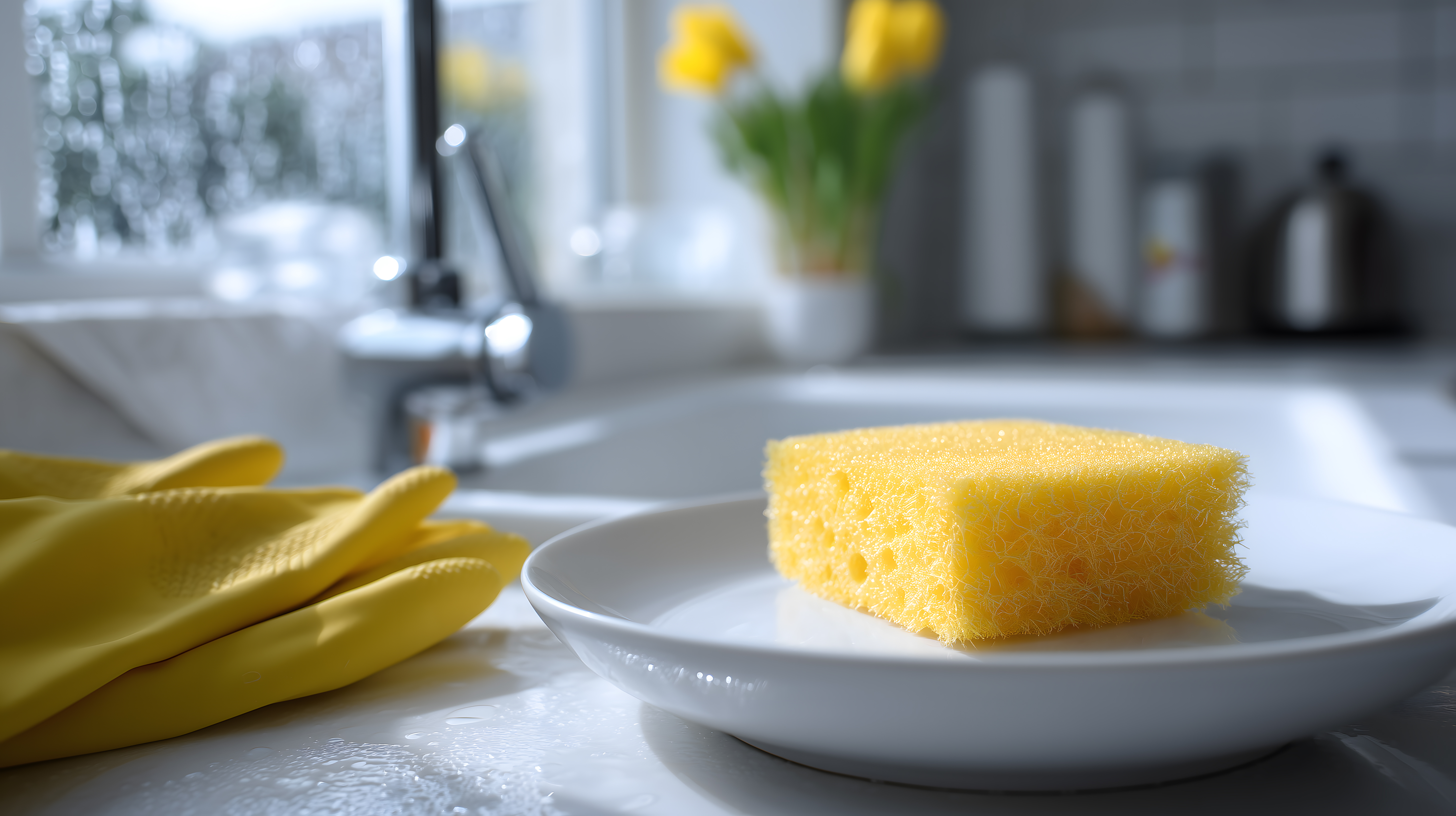 Gelber Schwamm mit Gummihandschuhen in heller Küche von Marco Verch unter Creative Commons 4.0