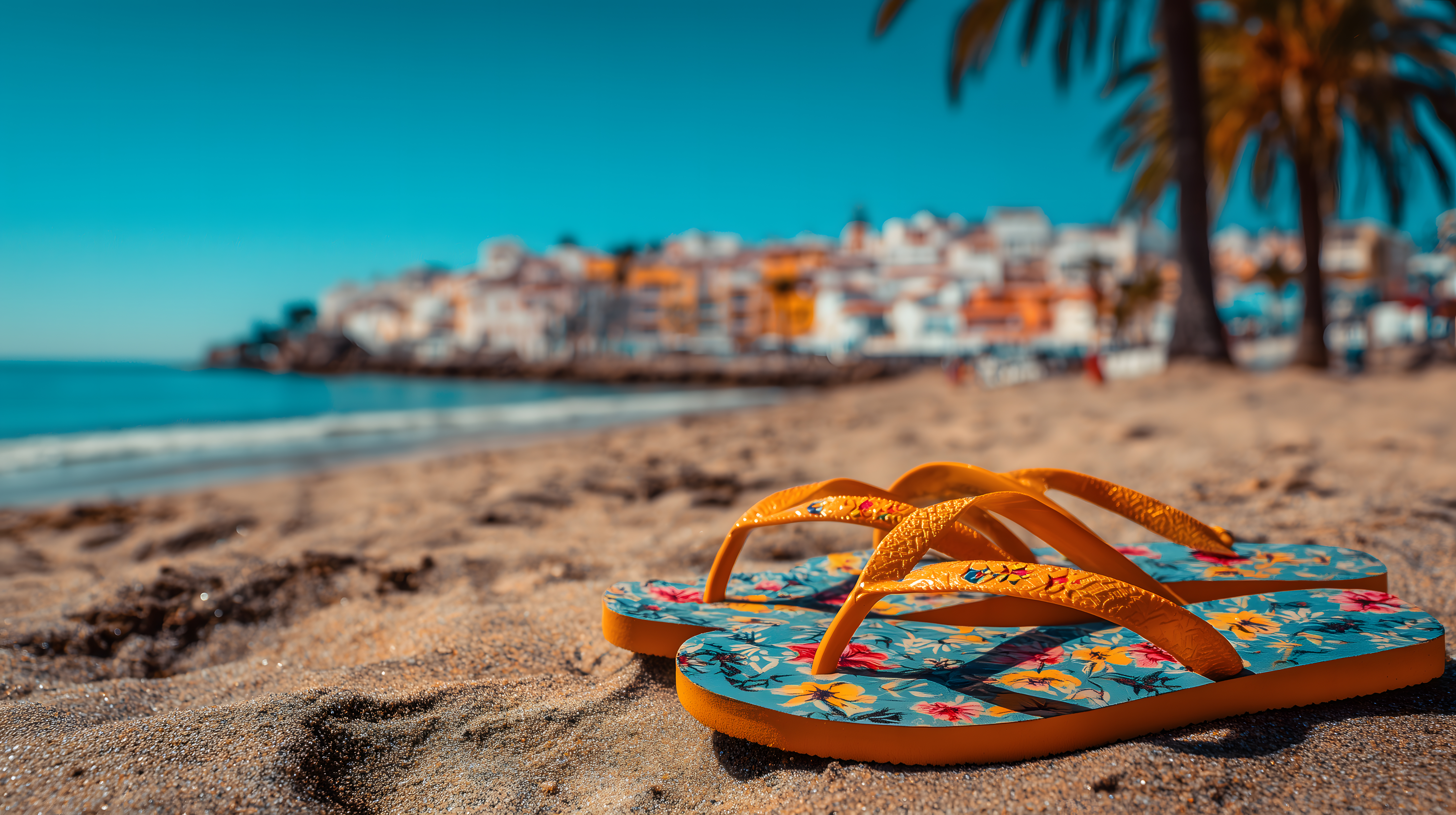 Das Bild zeigt eine Strandszene mit orangefarbenen Flip-Flops auf weißem Sand vor einer malerischen Küstenstadt. Der Hintergrund ist von einem kristallklaren, türkisfarbenen Meer und einem strahlend blauen Himmel geprägt. Eine Palme im Vordergrund verleiht der Szene einen tropischen Flair. Die scharfe Fokussierung auf die Flip-Flops und die unscharfe Darstellung des Hintergrunds lenken die Aufmerksamkeit des Betrachters auf das Hauptmotiv.