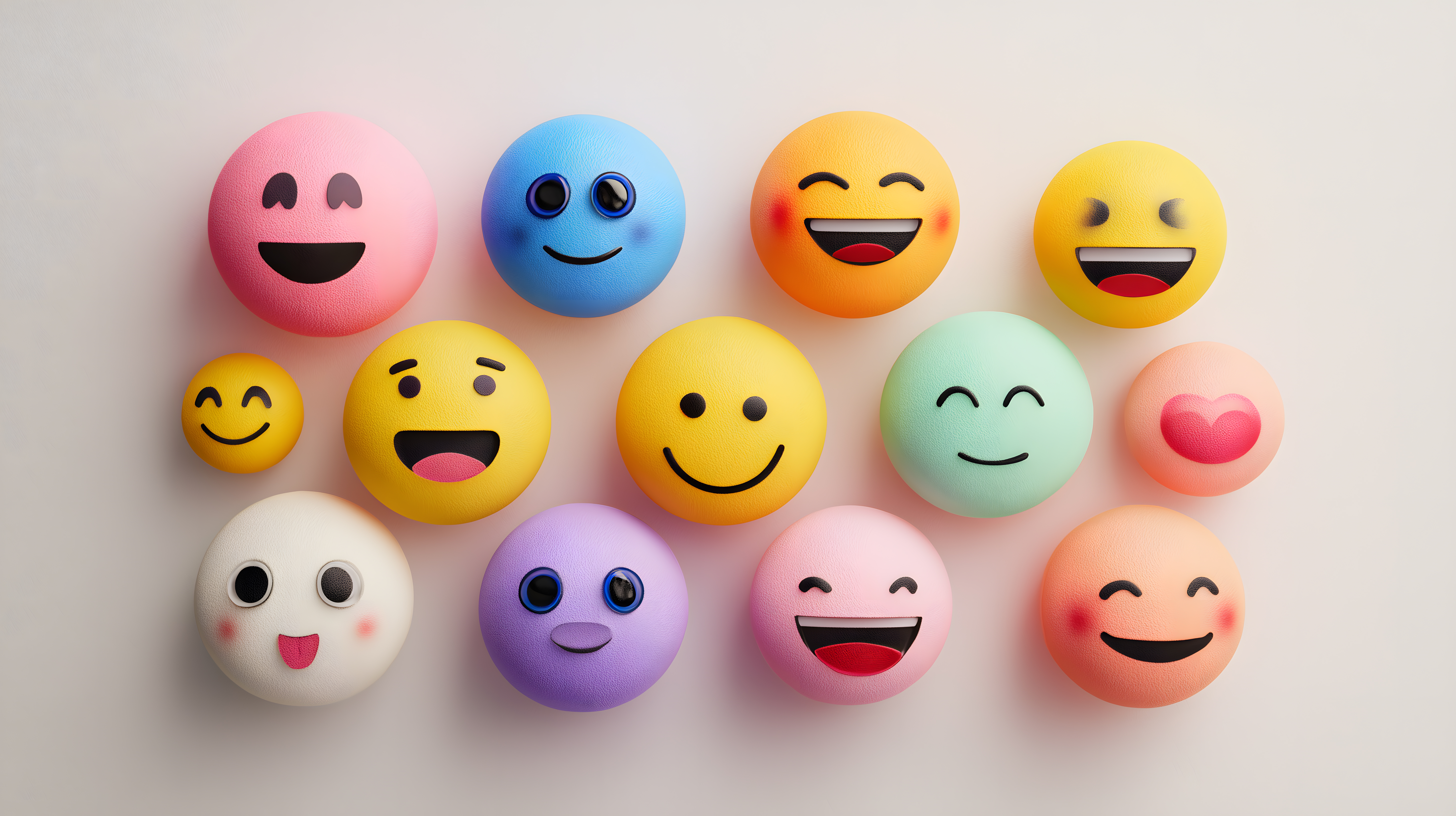 Das Foto zeigt eine Vielzahl bunter, lachender Emojis in verschiedenen Farben und Ausdrücken. Die Emojis sind in einer Draufsicht-Komposition angeordnet und präsentieren eine fröhliche, bunte Stimmung. Die Farbpalette reicht von kräftigen Gelb-, Orange- und Blautönen bis hin zu sanfteren Pastelltönen wie Rosa und Mintgrün. Die Anordnung der Emojis schafft eine harmonische und einladende Atmosphäre.