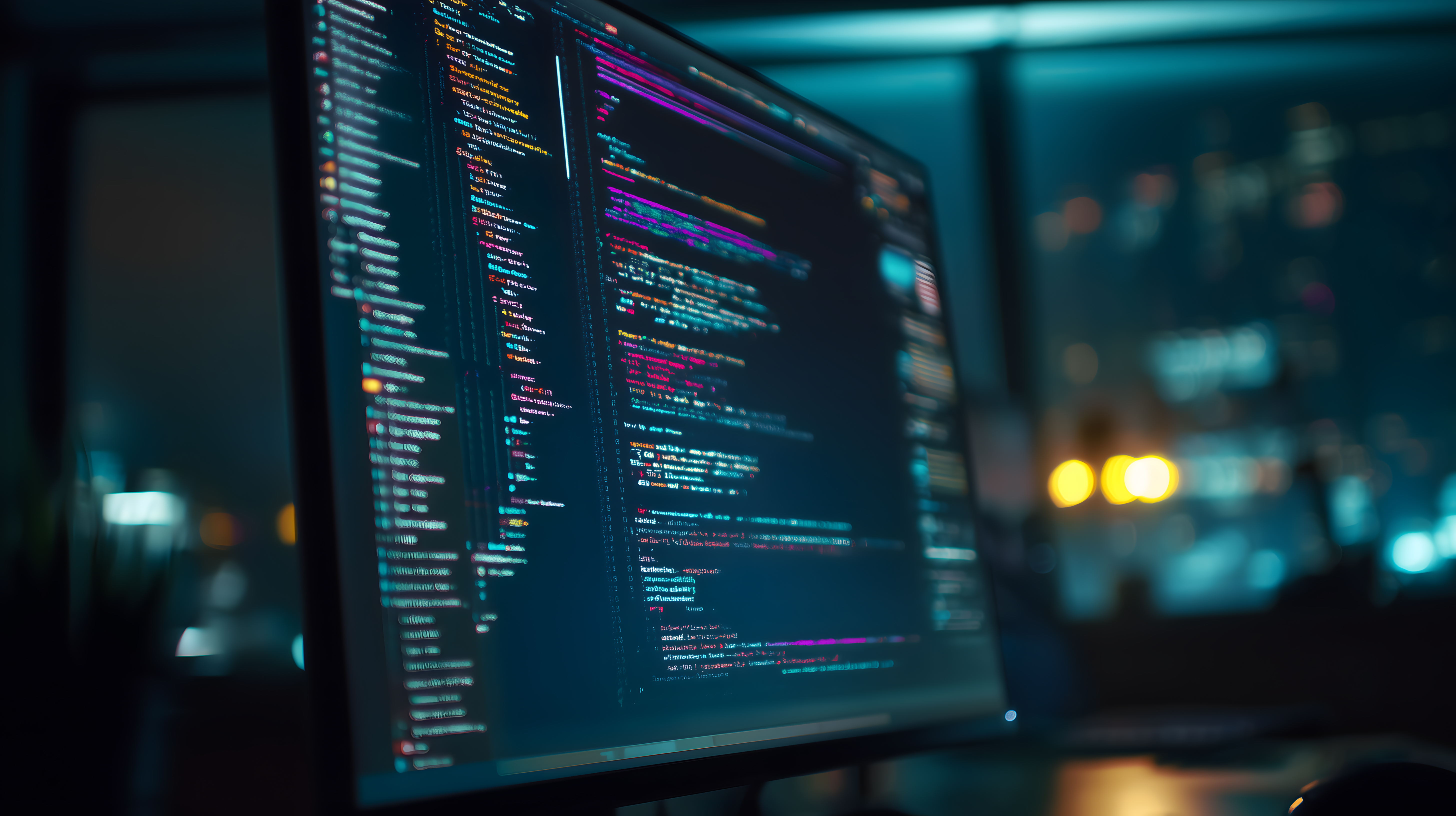 Das Bild zeigt einen Computerbildschirm, auf dem komplexer Programmcode zu sehen ist. Die Perspektive ist eine Nahaufnahme, die den Fokus auf die detailreichen Codezeilen lenkt. Die Farbpalette ist düster gehalten, dominiert von Blau- und Grautönen, was eine technische und professionelle Atmosphäre schafft.
