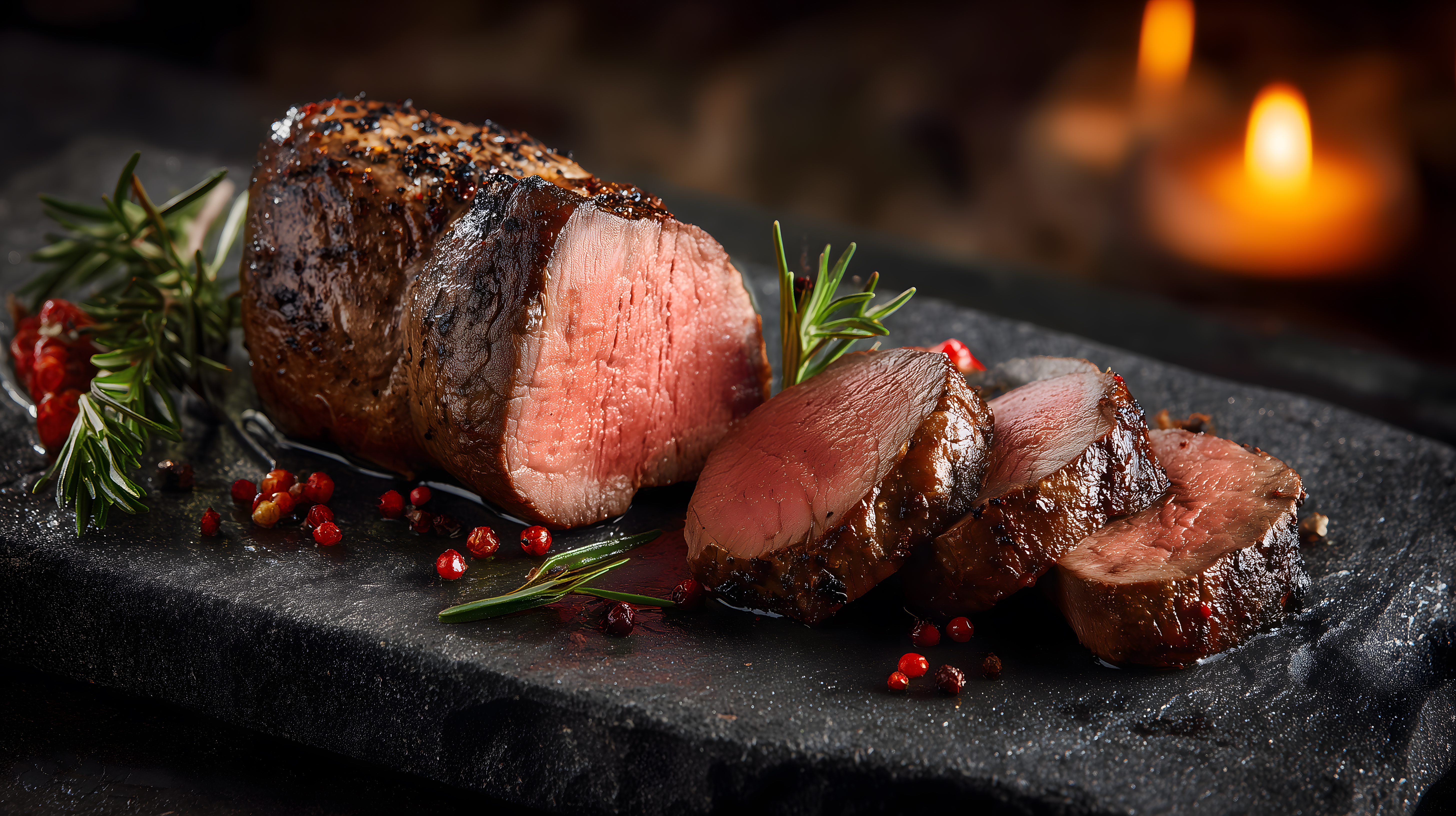 Das Bild zeigt ein perfekt zartrosa gegarten Steak auf einem dunklen Schieferstein. Die Oberfläche des Fleischs ist mit einer karamellisierten Kruste überzogen, während der Kern noch leicht rosa schimmert. Umgeben ist das Steak von frischen Rosmarin-Zweigen und Granatapfel-Kernen, die dem Gericht einen frischen, fruchtigen Kontrast verleihen.