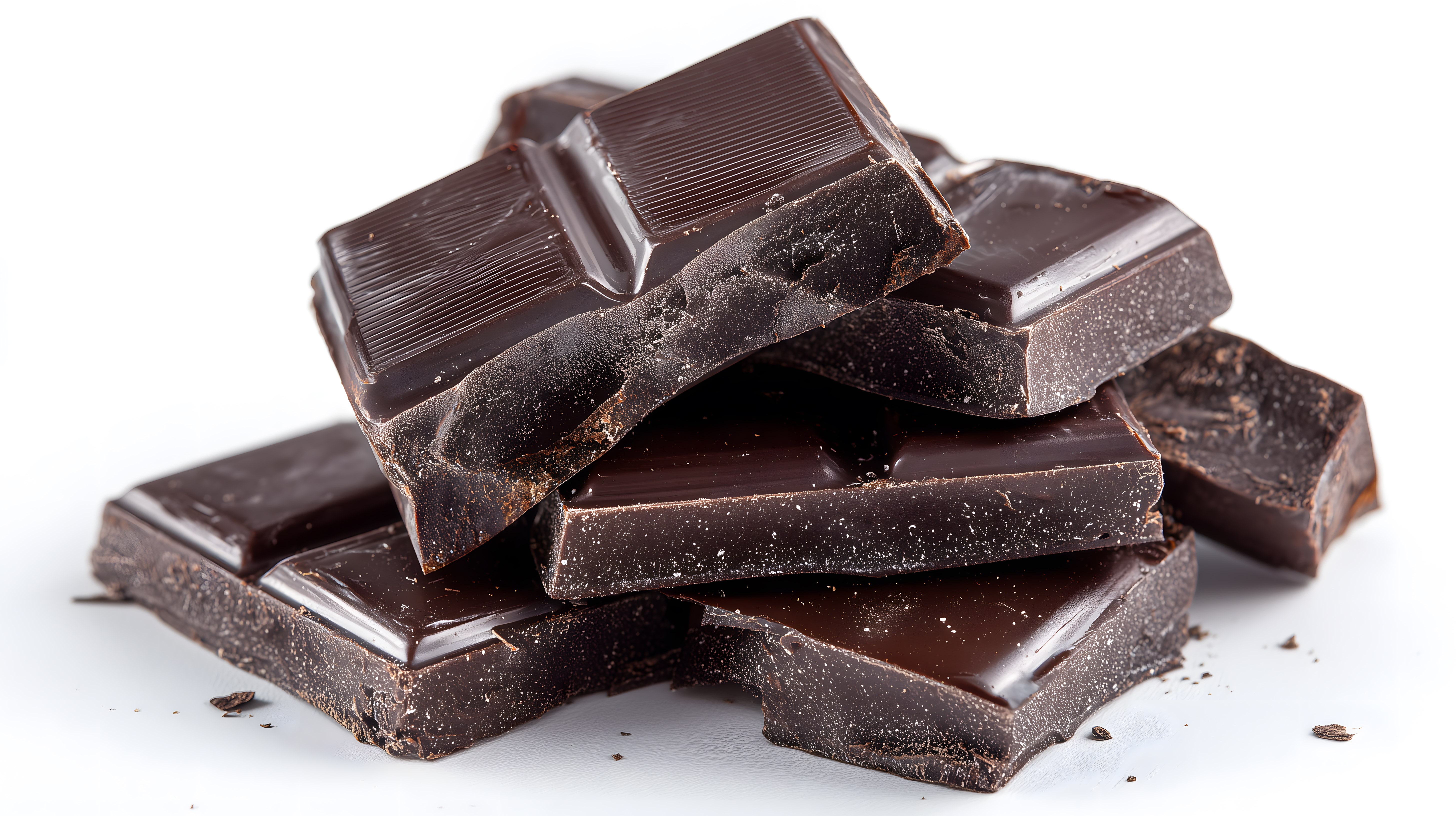 Das Bild zeigt eine Nahaufnahme von dunkelbraunen, glänzenden Schokoladenstücken, die in einer gestapelten Anordnung auf einem weißen Hintergrund liegen. Die Oberfläche der Schokolade ist leicht strukturiert, was eine appetitliche Textur verleiht. Die Farbpalette reicht von einem tiefen Dunkelbraun bis hin zu leichten Schattierungen und Spiegelungen auf der Oberfläche.