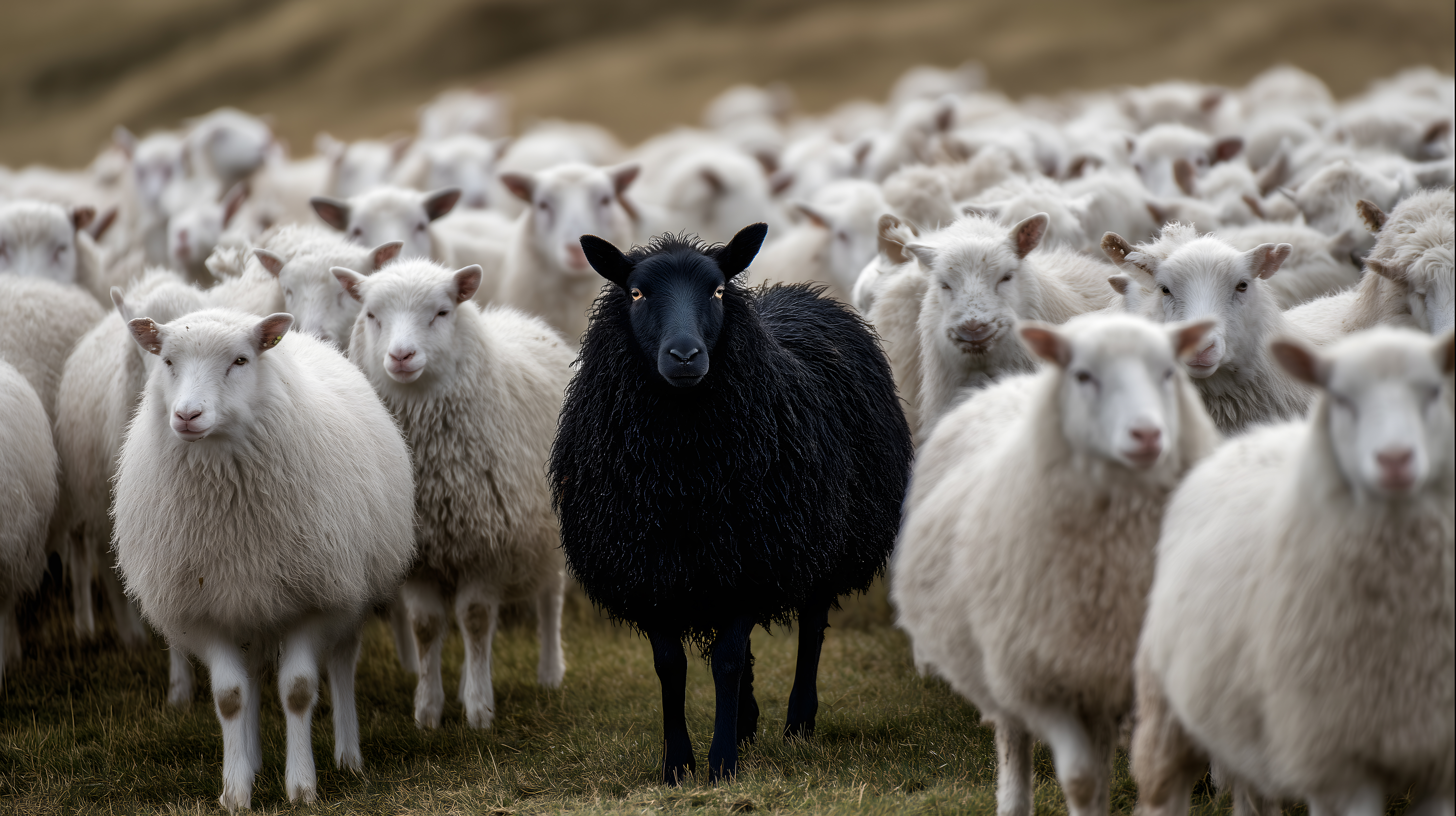 Das Foto zeigt eine Herde weißer Schafe, die von einem schwarzen Schaf angeführt wird. Die Schafe stehen auf einer grünen Wiese vor einem leicht verschwommenen Hintergrund, der eine ländliche Umgebung andeutet. Die Kamera ist direkt auf Augenhöhe der Tiere platziert, was eine nahsichtige und detaillierte Perspektive erzeugt. Die Farbpalette ist hauptsächlich in Grautönen und Schwarz-Weiß-Kontrasten gehalten, was dem Bild eine stimmungsvolle und dramatische Atmosphäre verleiht.