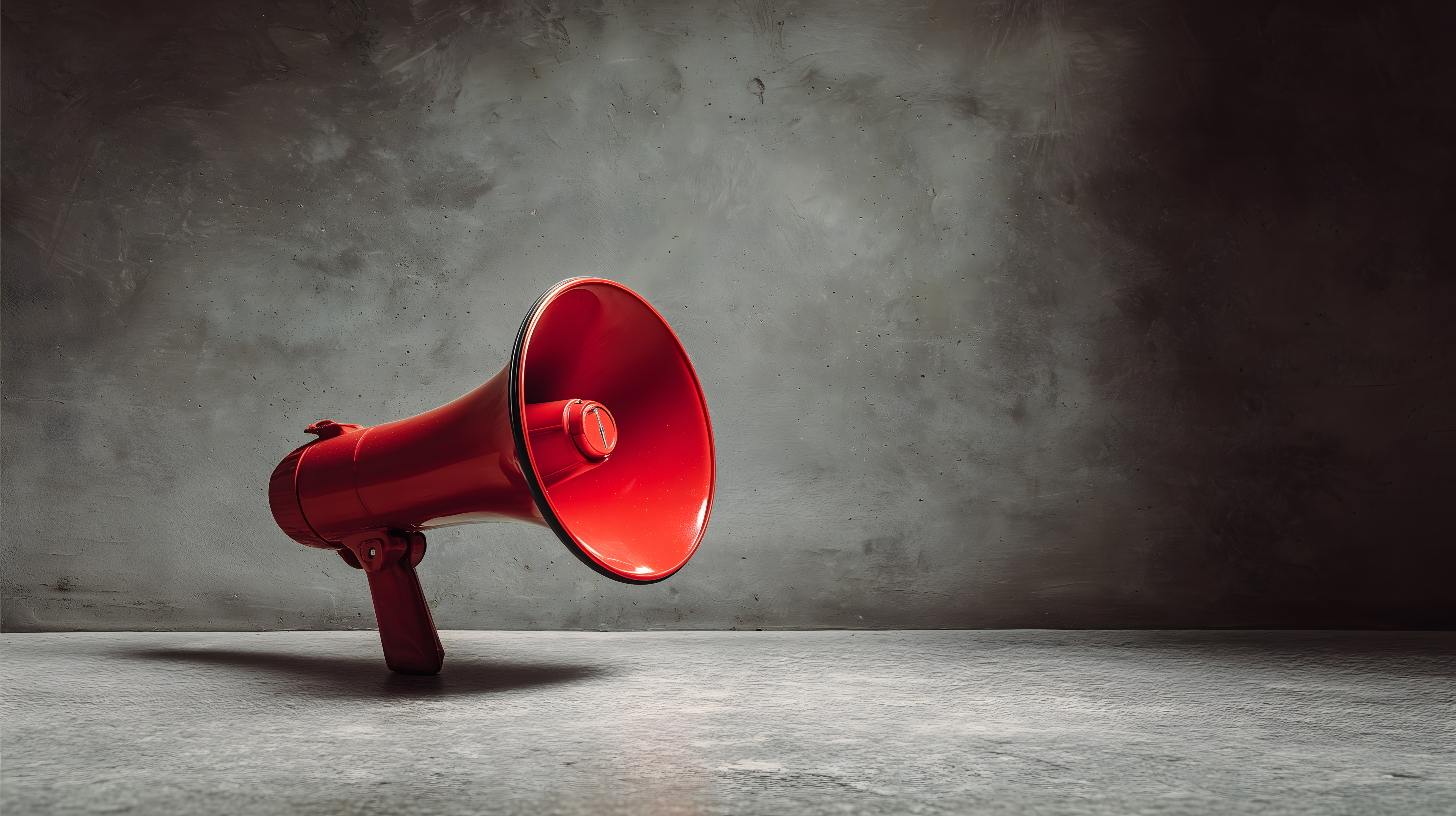 Das Bild zeigt ein rotes Megaphon vor einem dunklen Hintergrund. Das Megaphon nimmt den Großteil des Bildes ein und ist in kräftigen Rot-Tönen gehalten. Der Hintergrund ist eher schlicht, in verschiedenen Grautönen gehalten, was den Fokus auf das auffallende Megaphon lenkt.