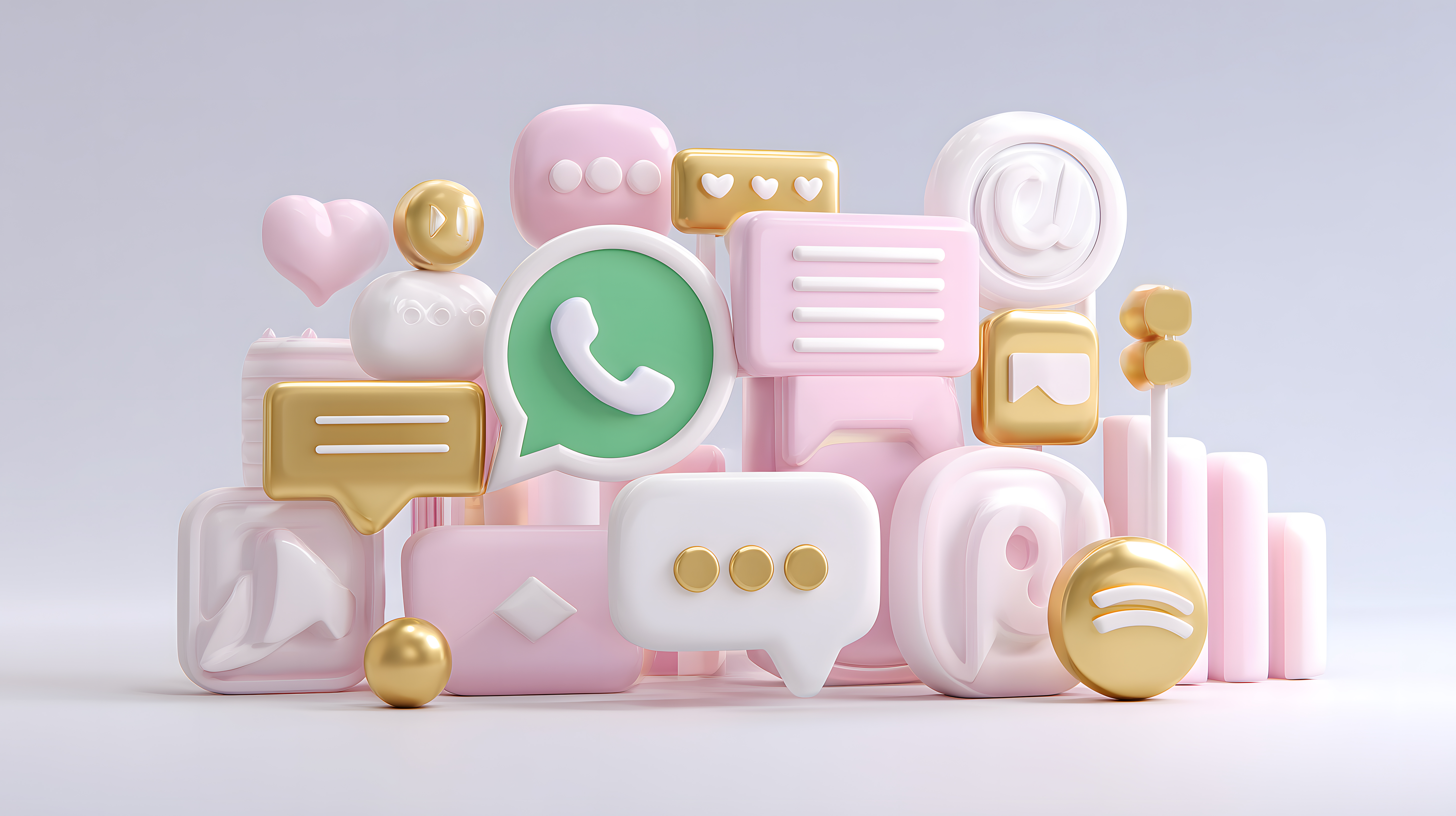 Das Foto zeigt eine Vielzahl von bunten, abstrakten Objekten, die mit dem Thema Kommunikation und Messaging assoziiert werden können. Die Objekte haben eine glatte, moderne Oberfläche und eine Farbpalette in Pastelltönen von Weiß, Rosa und Grün, die von goldenen Akzenten ergänzt wird. Die Komposition ist symmetrisch und fokussiert, wodurch die Aufmerksamkeit des Betrachters auf die zentralen Elemente gelenkt wird.