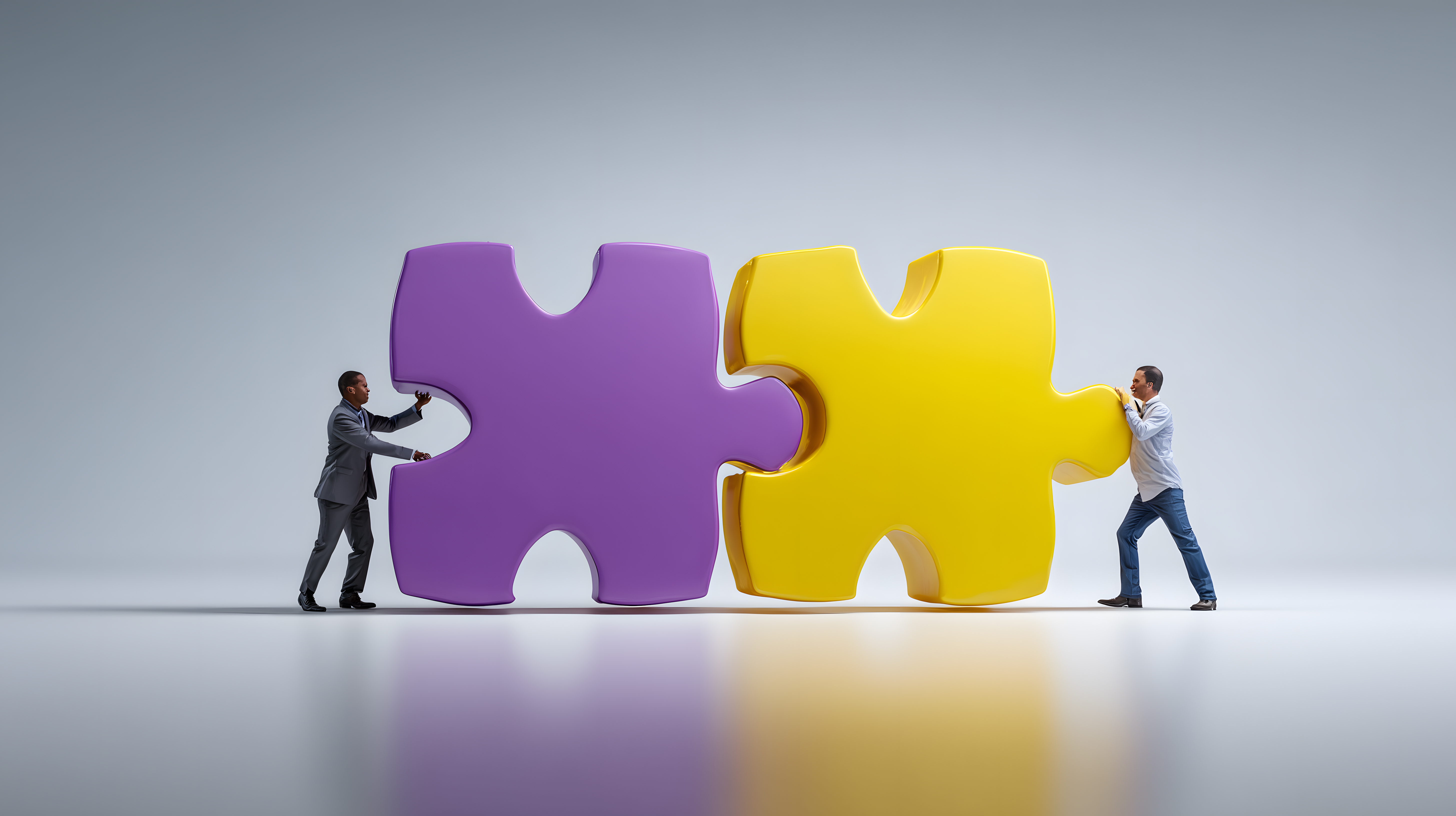 Das Foto zeigt zwei Geschäftsmänner, die versuchen, zwei große, bunte Puzzleteile zusammenzufügen. Die violette und gelbe Farbe der Puzzlestücke hebt sie deutlich vom neutralen, grauen Hintergrund ab. Die Perspektive und Komposition des Bildes lenken den Blick direkt auf die Interaktion der beiden Männer bei dem Versuch, die Puzzleteile zusammenzusetzen.
