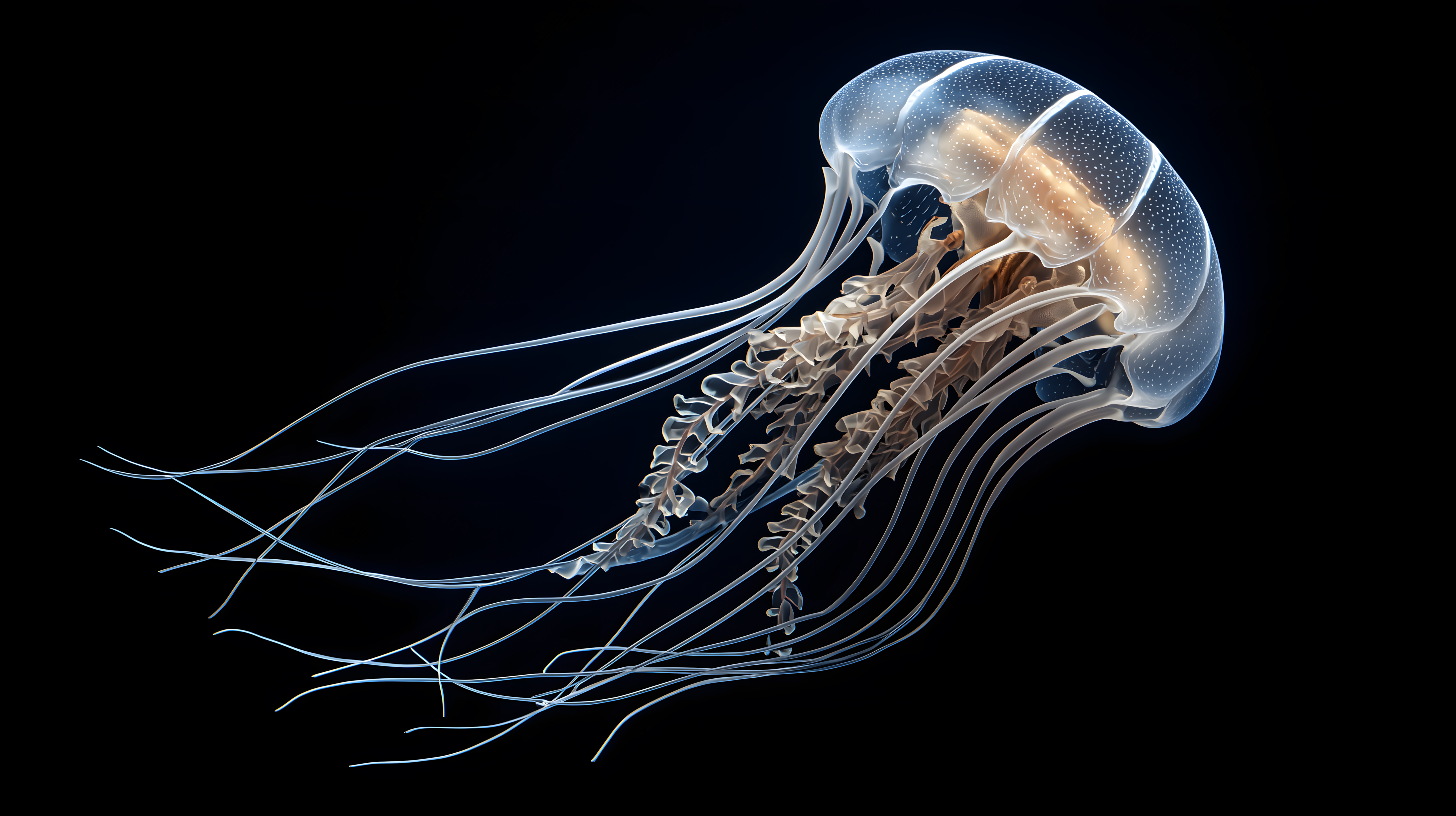 Dieses Foto zeigt eine transparente Qualle in einem schwarzen Hintergrund. Das Bild ist sehr detailliert und lichtdurchlässig, wodurch die faszinierenden Strukturen und Bewegungen der Qualle deutlich sichtbar werden. Die Komposition des Bildes ist minimalistisch und konzentriert sich vollständig auf das Hauptobjekt, die Qualle.