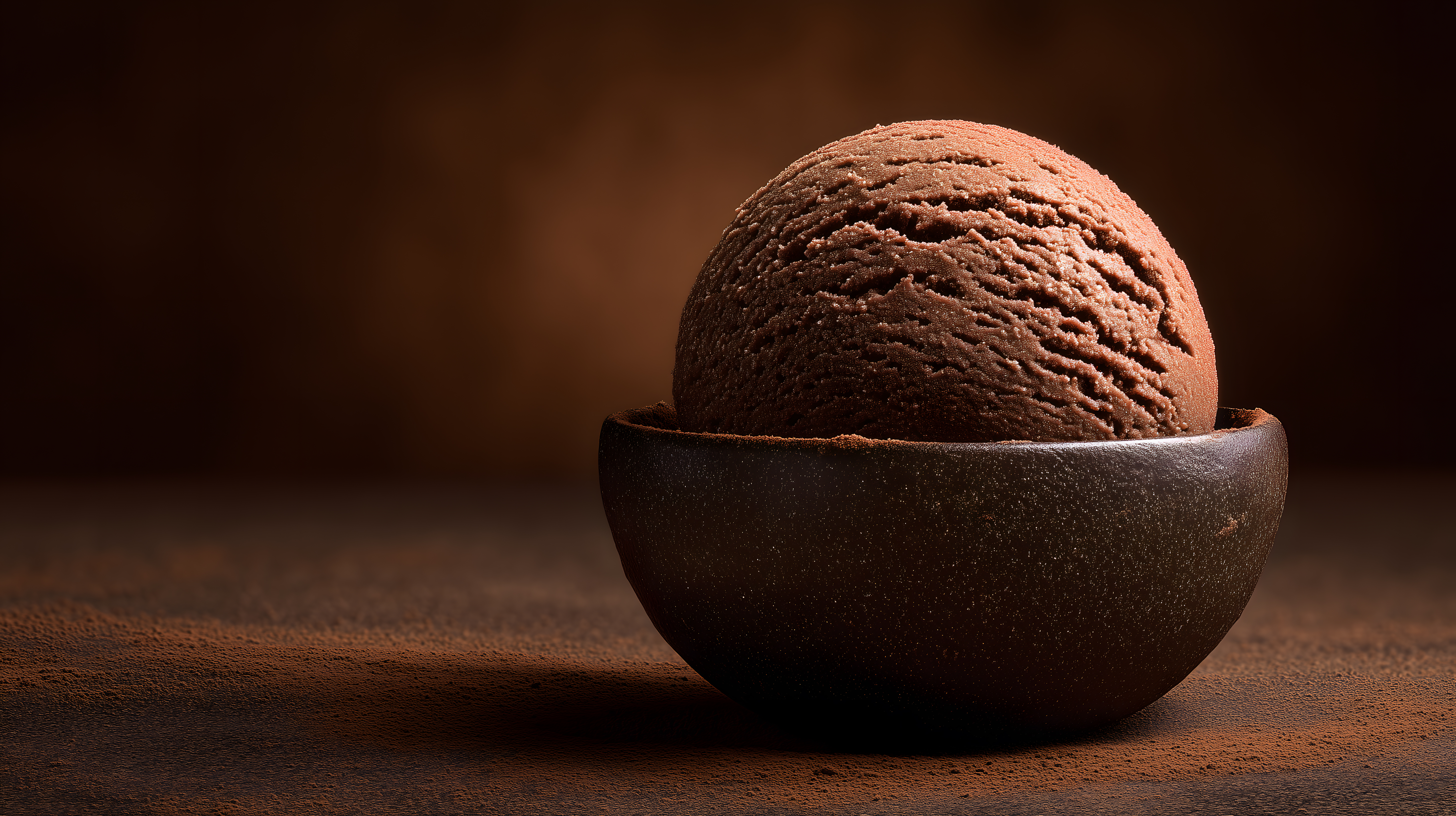 Das Bild zeigt eine detaillierte Nahaufnahme einer Kugel aus Schokoladen-Eiscreme in einer schwarzen Schale. Die Textur der Eiskugel ist fein und gleichmäßig, während die dunkle Schale einen stimmungsvollen Kontrast bildet. Die warme, satte Farbpalette aus Brauntönen verleiht dem Foto eine appetitliche und verlockende Ausstrahlung.