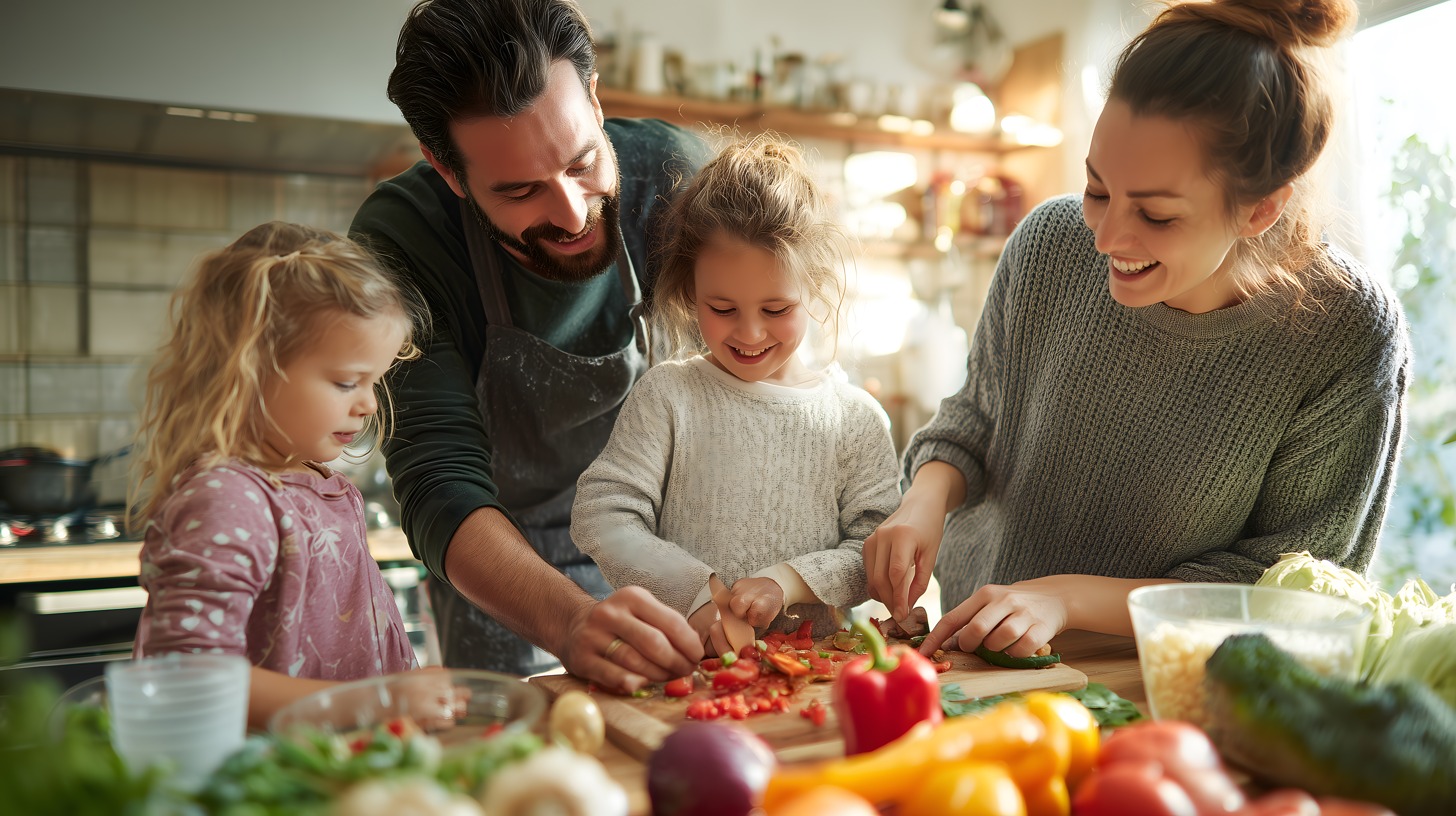 Das Bild zeigt eine fröhliche Familie, die gemeinsam in der Küche Gemüse schneidet und zubereitet. Im Vordergrund sind verschiedene Gemüsesorten wie Paprika, Tomaten und Salat zu sehen, die auf einer Holzplatte liegen. Die Familie, bestehend aus einem Vater, einer Mutter und zwei Kindern, lacht und hat sichtlich Spaß an der Zubereitung des Essens.