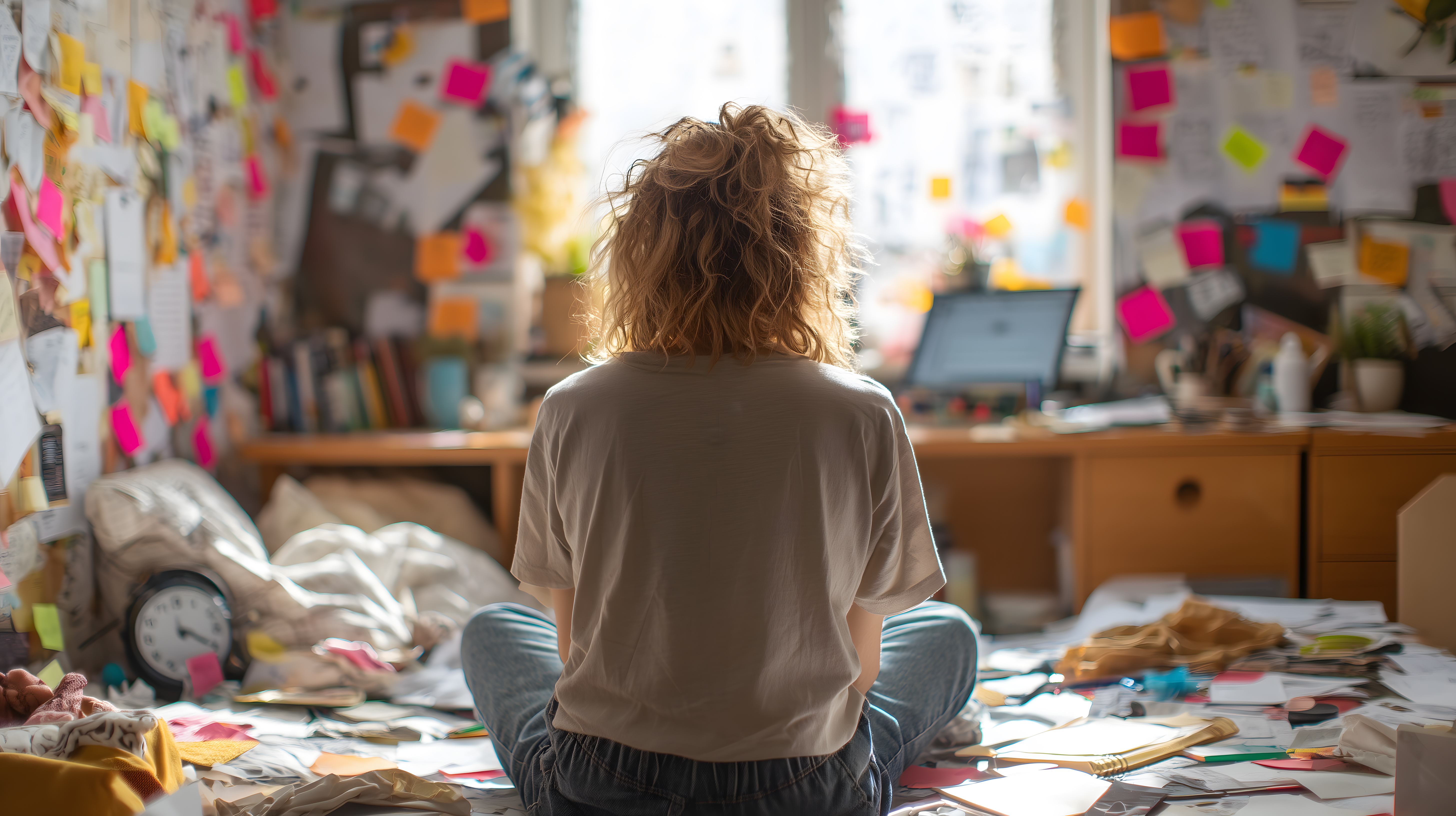 Das Foto zeigt eine Nahaufnahme einer kreativen Arbeitsumgebung. Der Blickwinkel ist von hinten auf eine Person gerichtet, die in einem unordentlichen, aber farbenfrohen Raum sitzt. Ihre Haare sind lockig und unordentlich, was eine Atmosphäre der Konzentration und Kreativität vermittelt. Der Raum ist mit Büchern, Notizblöcken, Stiften und bunten Post-its übersät, die auf ein aktives Arbeitsumfeld hinweisen.
