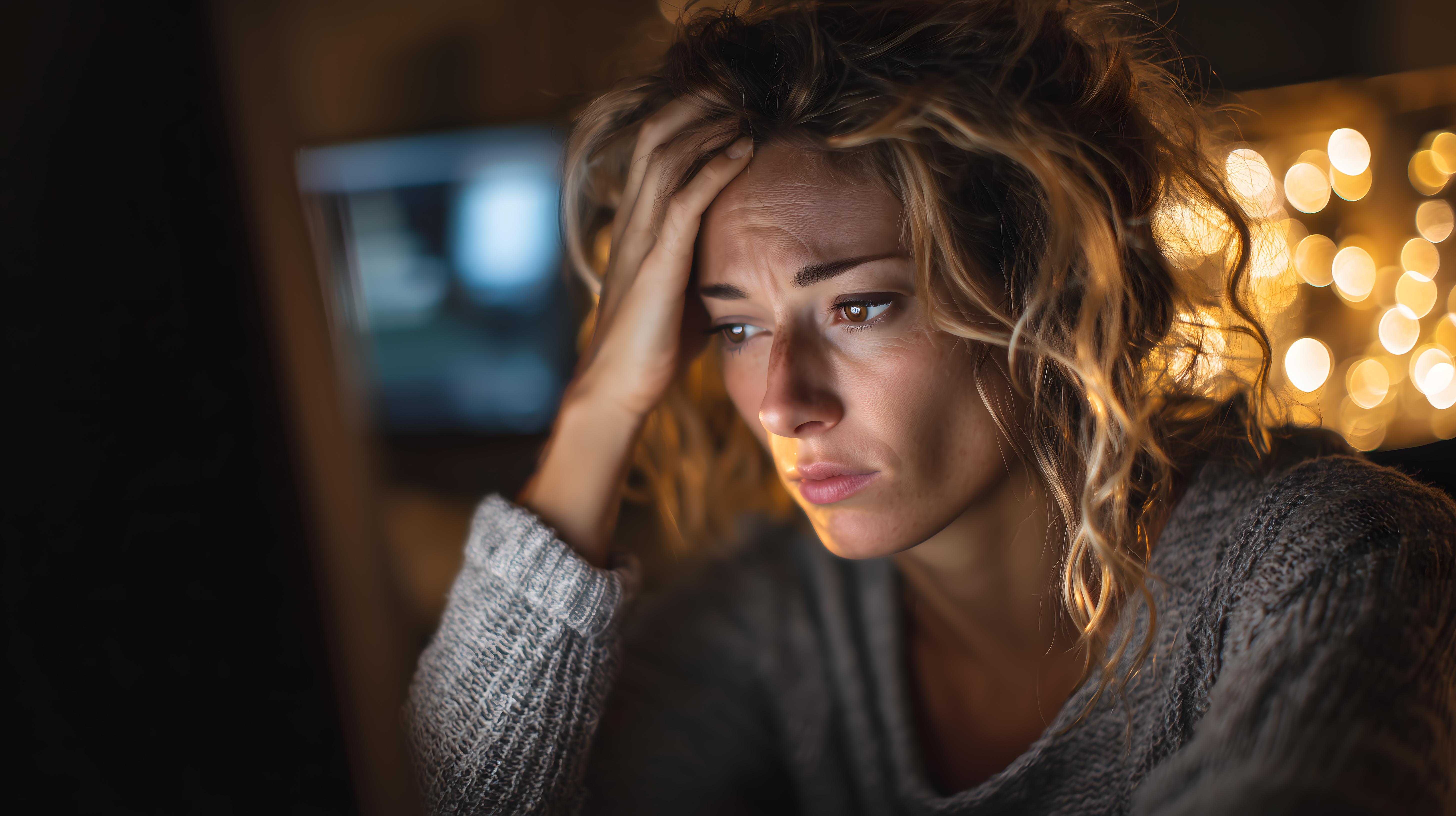Das Bild zeigt eine Nahaufnahme einer jungen Frau mit lockigem blonden Haar, die mit nachdenklichem Gesichtsausdruck in einem dunklen Raum zu sehen ist. Die Stimmung wird durch die warmen Lichter im Hintergrund und den weichen Fokus der Kamera betont, was eine intensive emotionale Atmosphäre erzeugt.