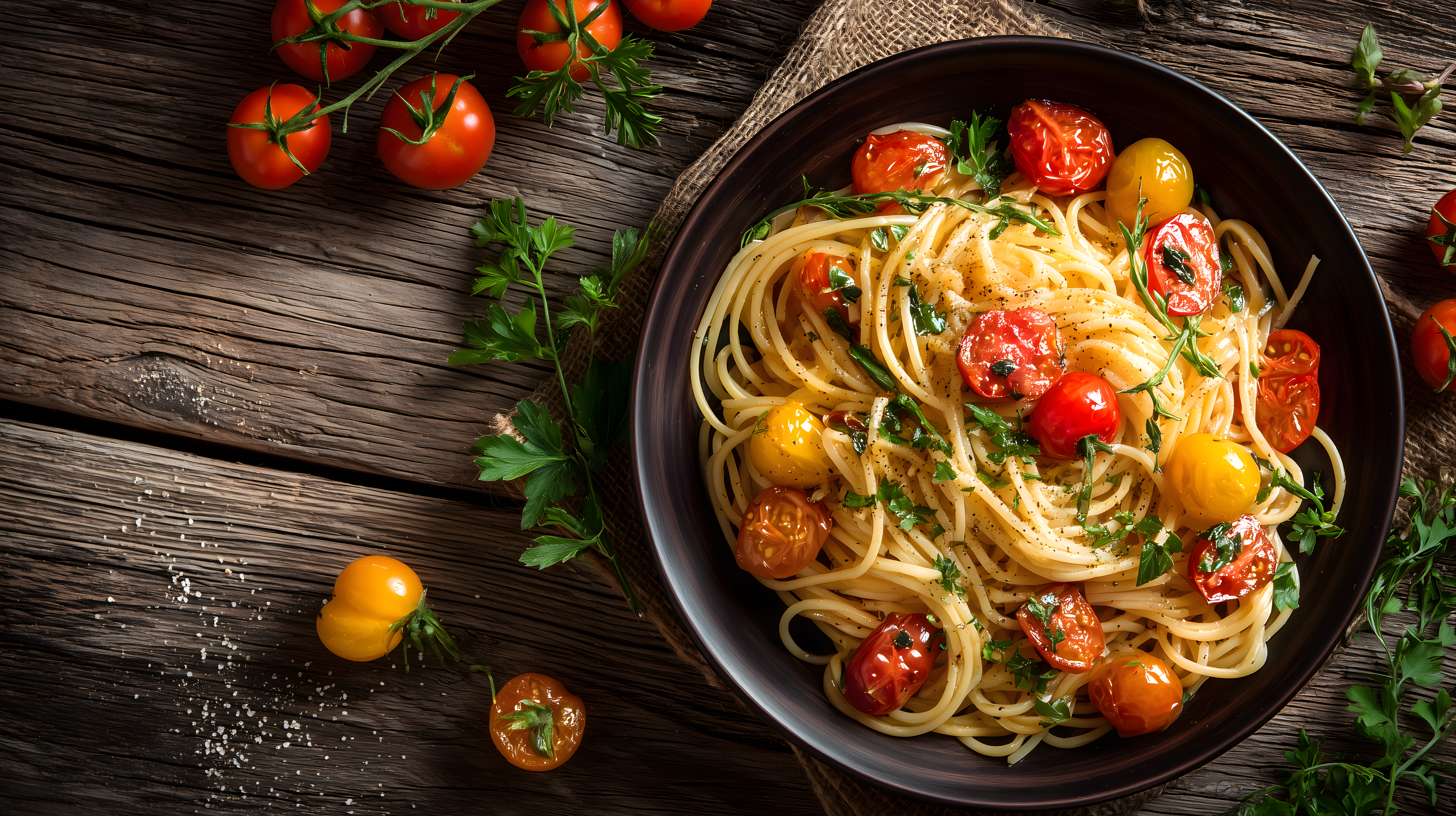 Das Foto zeigt eine Nahaufnahme einer Pasta-Gerichte auf einem dunklen Holztisch. Die Spaghetti-Nudeln sind mit frischen, bunten Kirschtomaten, Petersilie und Olivenöl garniert. Im Hintergrund sind weitere Tomaten und Kräuter zu sehen, die die natürliche und rustikale Atmosphäre unterstreichen. Die Farbpalette des Fotos ist warm und sättigend, mit den kräftigen Rottönen der Tomaten und dem dunklen Holzuntergrund.