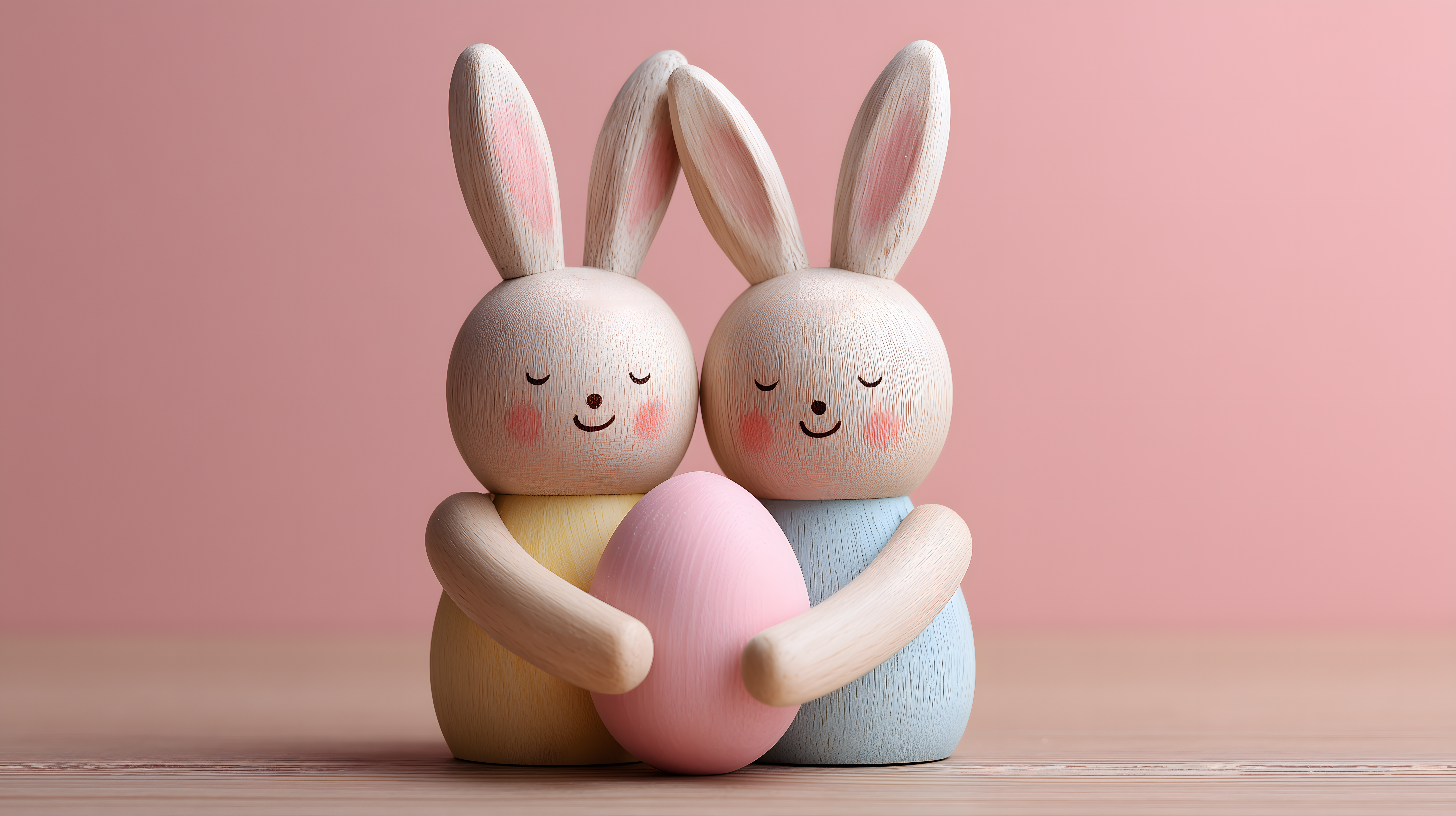 Das Foto zeigt zwei niedliche, lächelnde Osterhasen-Figuren, die ein großes rosa Osterei umarmen. Die Hasen sind aus Holz oder einem ähnlichen Material gefertigt und haben ein freundliches, vereinfachtes Gesichtsdesign mit rosa Wangen. Sie sind vor einem einfarbigen rosa Hintergrund platziert, der den Fokus auf die Osterdekorationen lenkt.