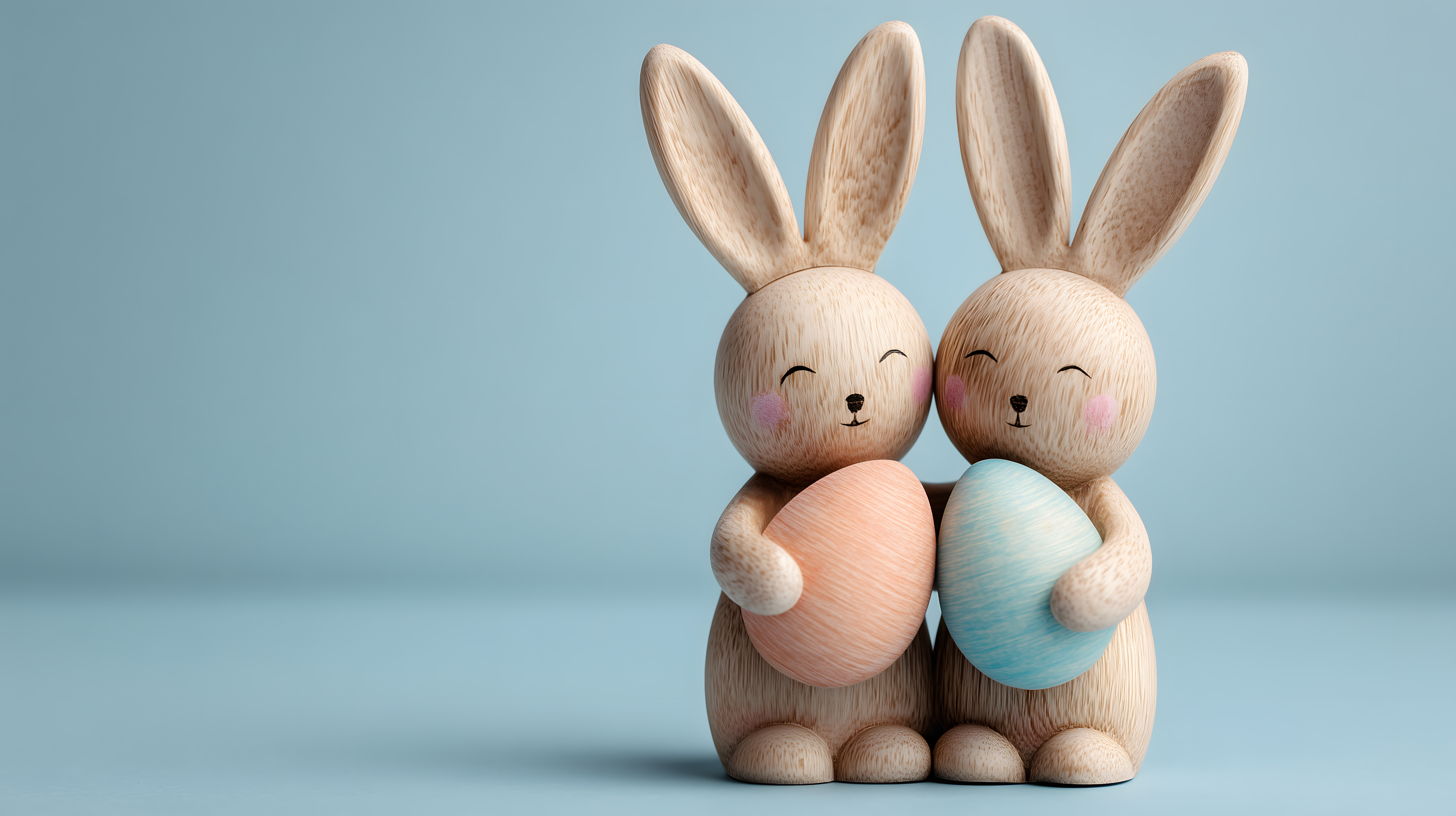 Das Foto zeigt zwei niedliche und detailreich gestaltete Holzfiguren von Osterhasen, die einander lächelnd umarmen und jeweils ein bemaltes Ei in den Pfötchen halten. Der Hintergrund ist in einem beruhigenden Pastellton gehalten, wodurch die Hasen besonders hervorgehoben werden. Die Nahaufnahme und die symmetrische Komposition verleihen dem Bild eine harmonische und stimmungsvolle Atmosphäre.
