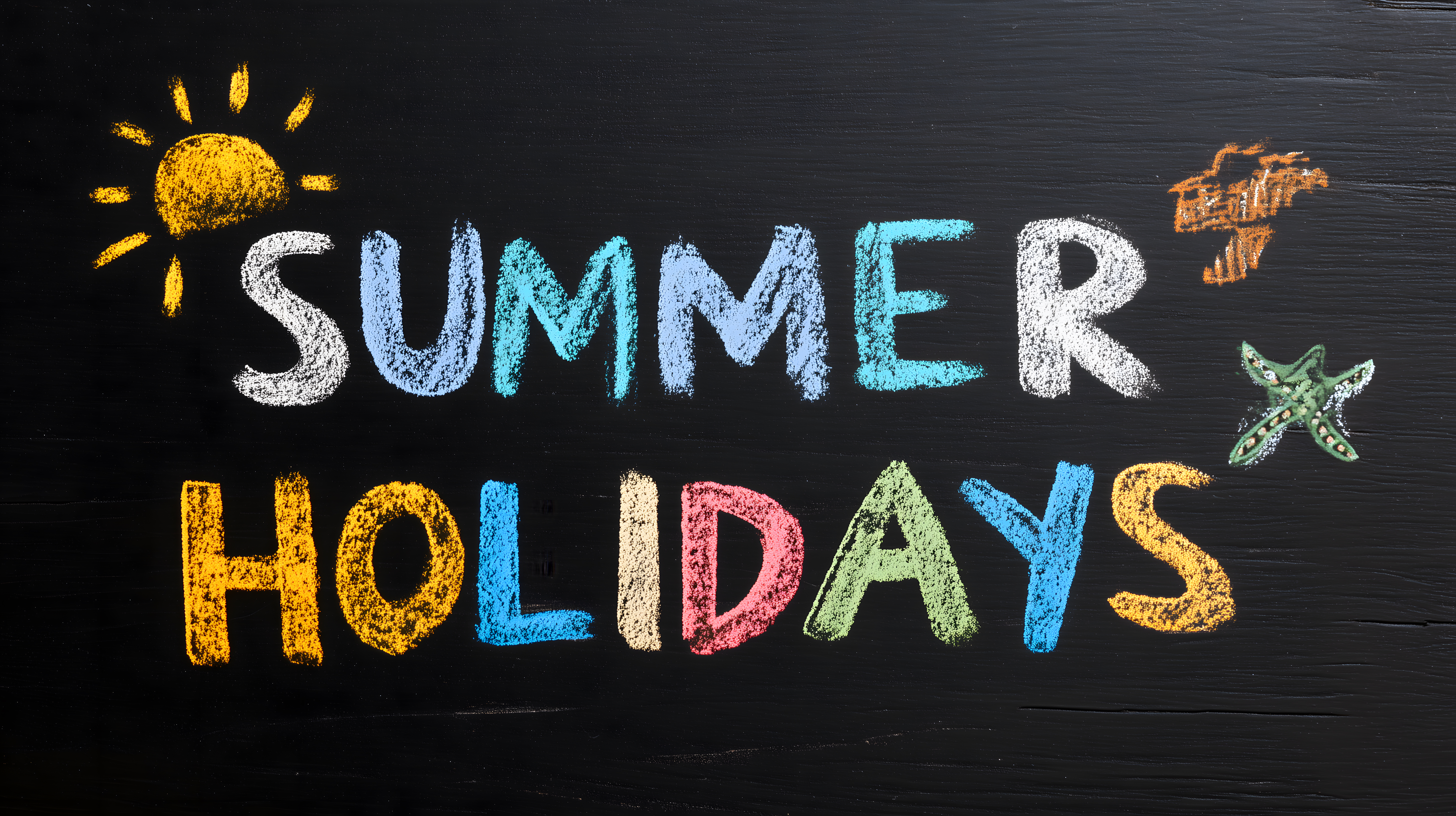 Das Bild zeigt eine farbenfrohe Kreidezeichnung auf einer schwarzen Tafel. Der Schriftzug "SUMMER HOLIDAYS" ist in verschiedenen, leuchtenden Farben dargestellt, umrahmt von Sonne und Meeresbewohnern wie Seestern und Seepferdchen. Die Perspektive ist eine klassische Draufsicht, die Komposition zentriert und symmetrisch aufgebaut.
