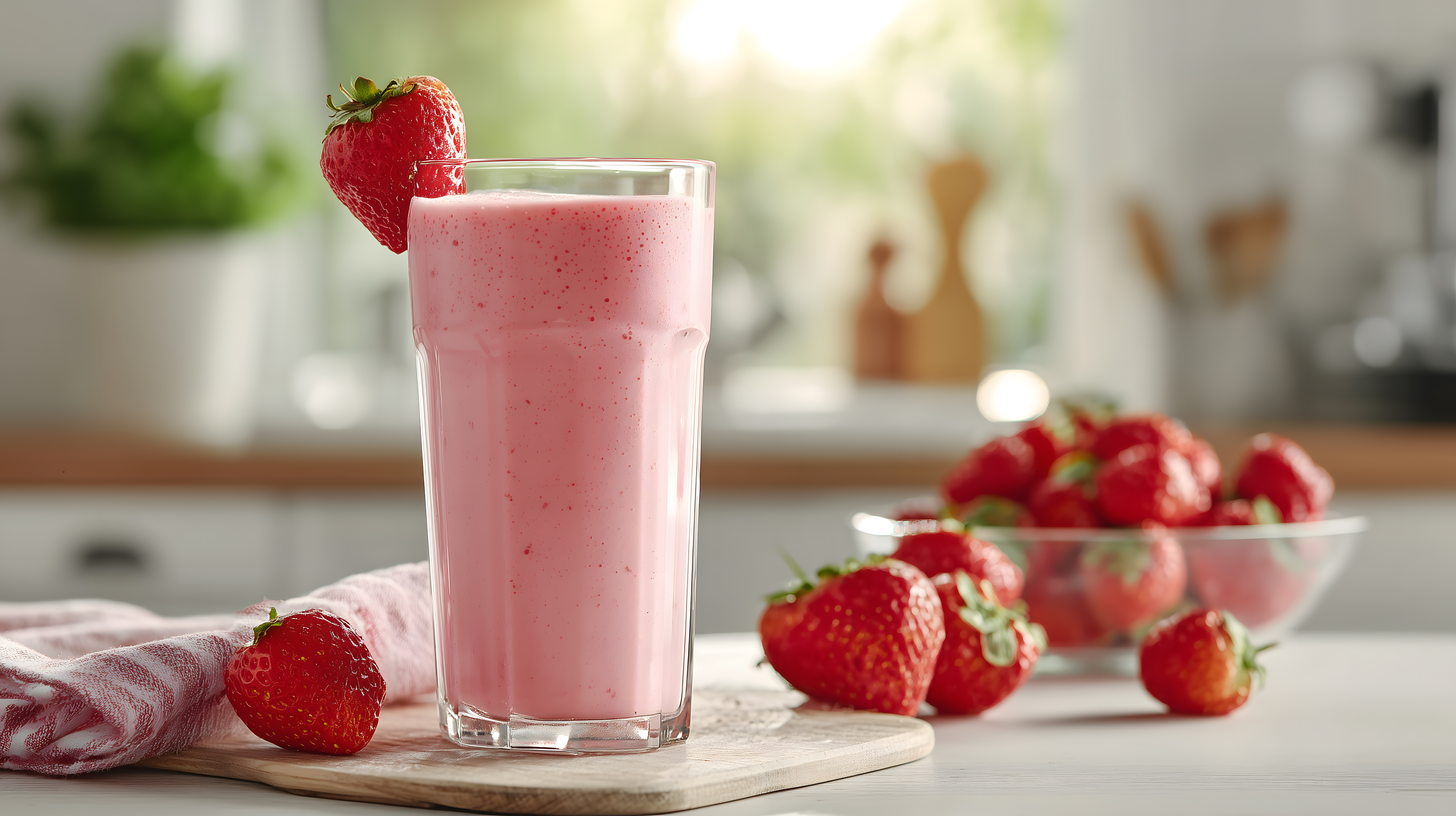 Das Foto zeigt ein köstliches Erdbeer-Smoothie-Getränk in einem hohen Glasbecher. Das Getränk ist von einer leuchtend roten Färbung, die von den frischen Erdbeeren herrührt, die als Garnierung auf dem Glas und in einer Schale daneben platziert sind. Der Hintergrund ist leicht unscharf, was den Fokus auf das Getränk und die Früchte lenkt. Die Komposition ist ausgewogen und die Beleuchtung lässt das Ganze in einem warmen, natürlichen Licht erscheinen.