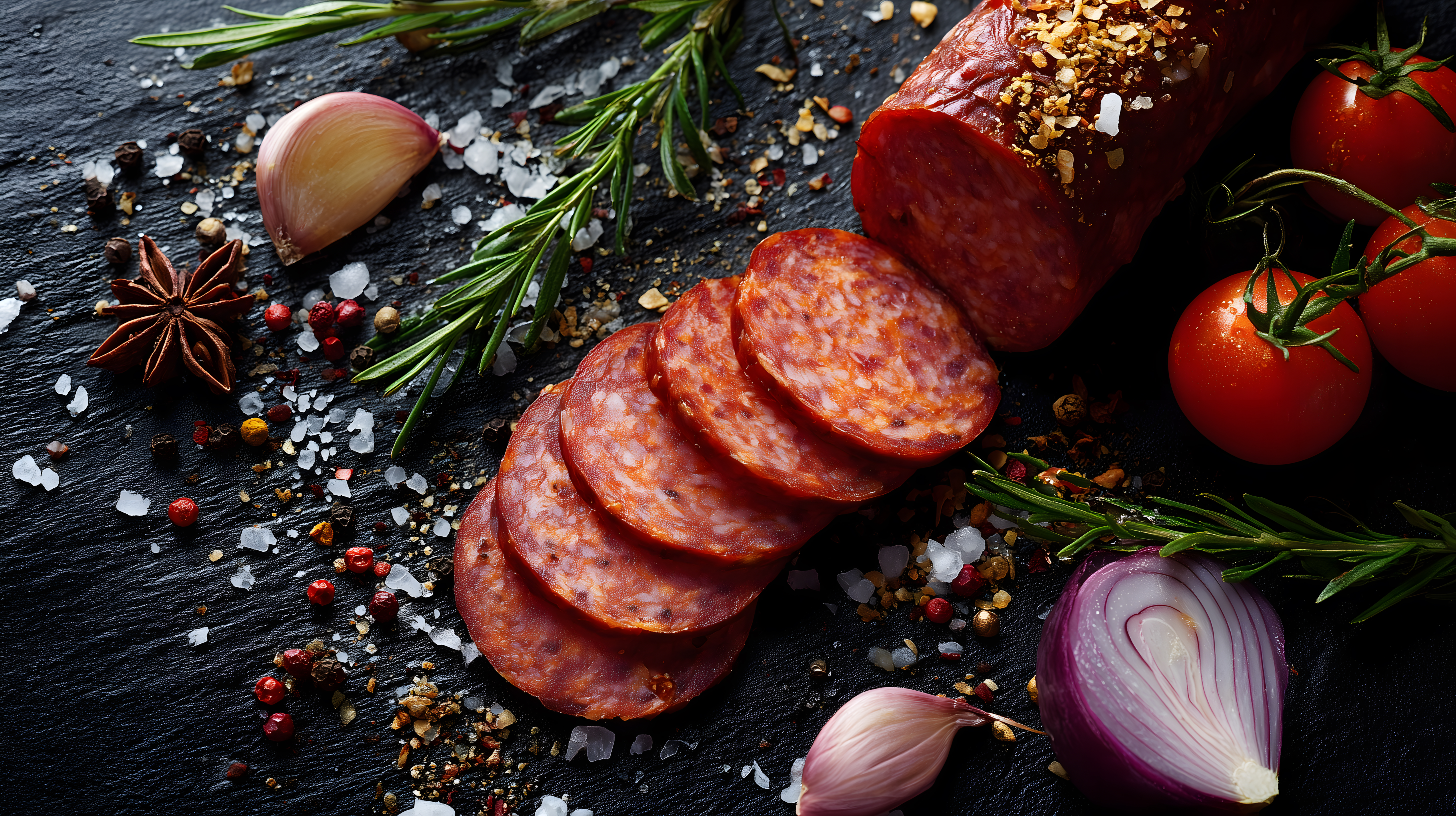 Das Bild zeigt eine köstliche Zusammenstellung von Zutaten für die Zubereitung von Fleischprodukten, wie z.B. Salami oder Chorizo. Im Vordergrund befinden sich geschnittene Scheiben einer würzigen Wurst, umgeben von frischen Kräutern, Gewürzen und Gemüse. Die Anordnung der Elemente in der Nahaufnahme vermittelt einen appetitlichen und stimmungsvollen Eindruck.
