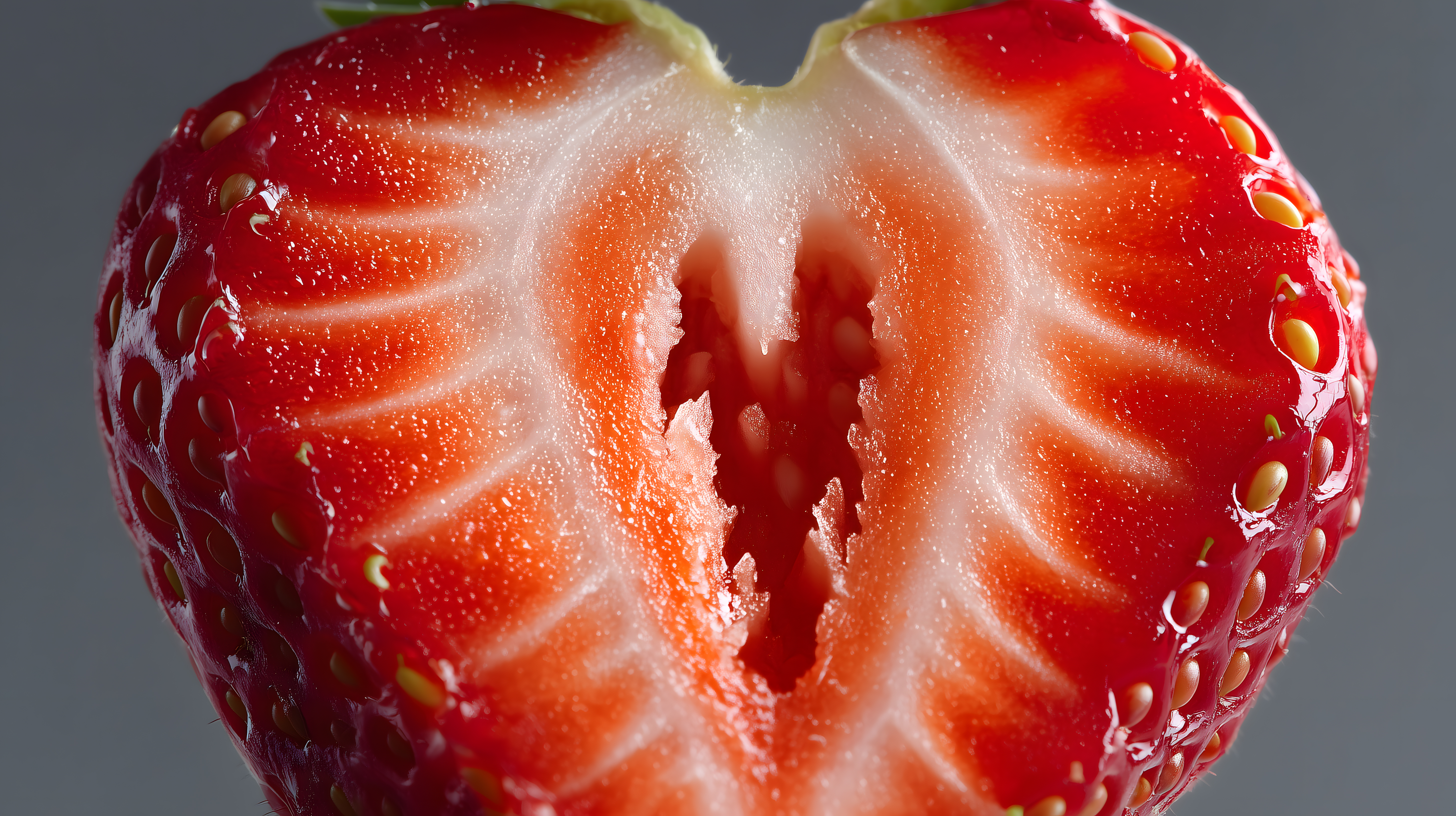 Das Bild zeigt eine Nahaufnahme einer roten Erdbeere. Die Erdbeere ist in ihrer ganzen Pracht zu sehen, mit glänzenden Früchten und sichtbaren Samen. Die Perspektive ist eine klassische Draufsicht, die die Details der Oberfläche der Erdbeere betont. Die Farbpalette ist hauptsächlich Rot in verschiedenen Abstufungen, mit einem kontrastreichen, grauen Hintergrund, der die Frucht in den Fokus rückt.