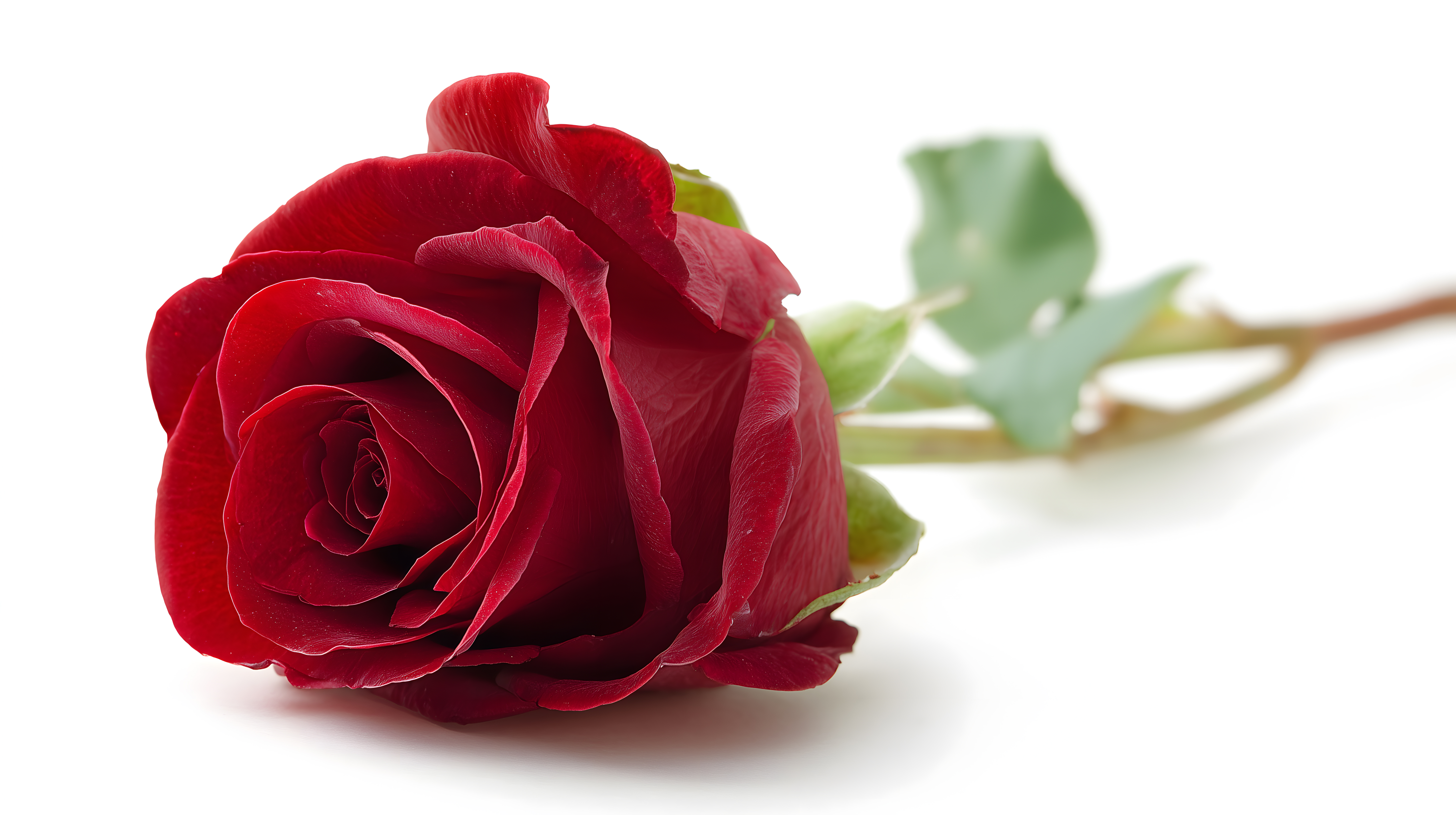 Dieses Foto zeigt eine nahaufgenommene Rote Rose vor weißem Hintergrund. Die Blüte ist in voller Pracht zu sehen, mit ihren samtig roten Blütenblättern, die sich in wunderschönen Formen falten. Die Detailansicht lässt die faszinierende Struktur und Textur der Rosenblätter erkennen. Das Bild besticht durch seine klare Fokussierung auf das Hauptmotiv und die reduzierte Farbpalette von Rot und Grün, die dem Foto eine elegante und stimmungsvolle Atmosphäre verleiht.