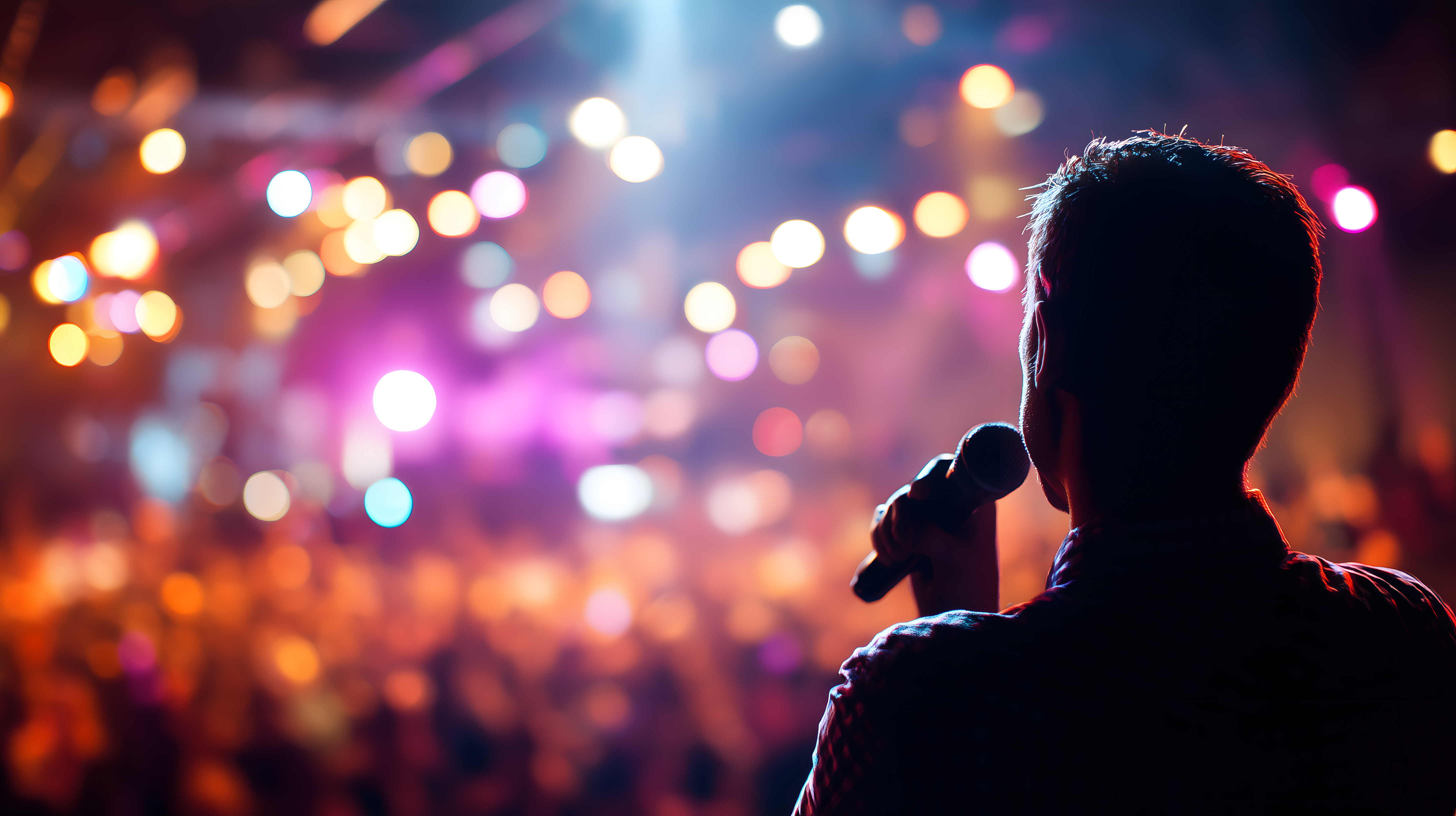 Das Bild zeigt einen Mann, der ein Mikrofon hält und vor einem Publikum steht. Der Fokus liegt auf der Silhouette des Sprechers, während im Hintergrund bunte, unscharfe Lichter zu sehen sind, die eine festliche und stimmungsvolle Atmosphäre schaffen. Die Farbpalette ist warm und dynamisch, mit Nuancen von Rot, Orange und Lila, die eine emotionale und energiegeladene Stimmung vermitteln.