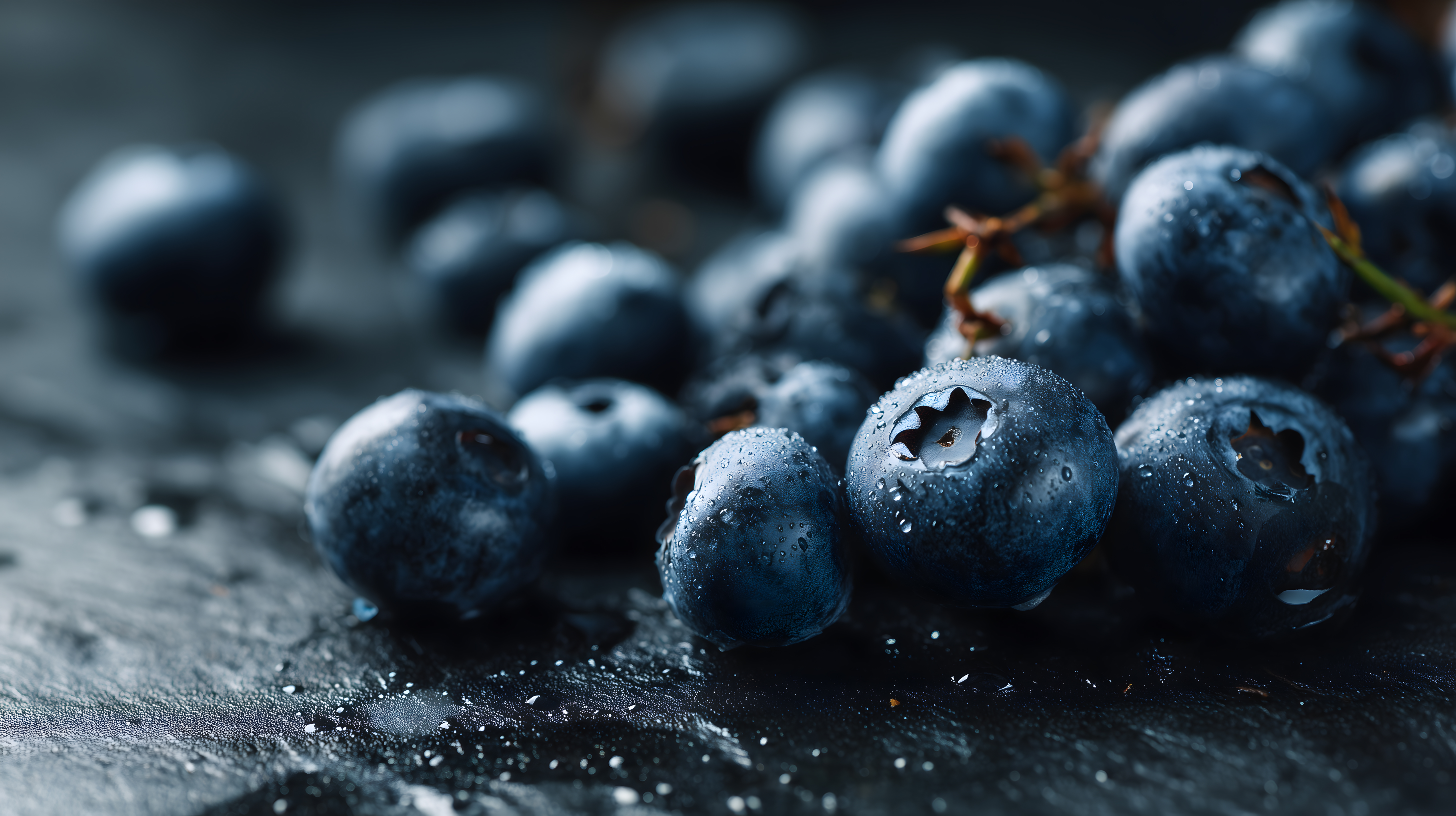 Das Bild zeigt eine Nahaufnahme von frischen, dunkelblau gefärbten Blaubeeren. Die Früchte sind mit feinen Tropfen bedeckt, was ihnen einen glänzenden, fast kristallinen Eindruck verleiht. Der Hintergrund ist dunkel und fokussiert die Aufmerksamkeit ganz auf die saftigen Beeren. Die Komposition wirkt stimmungsvoll und lässt den Betrachter den fruchtigen Geschmack und die Frische der Blaubeeren fast spüren.