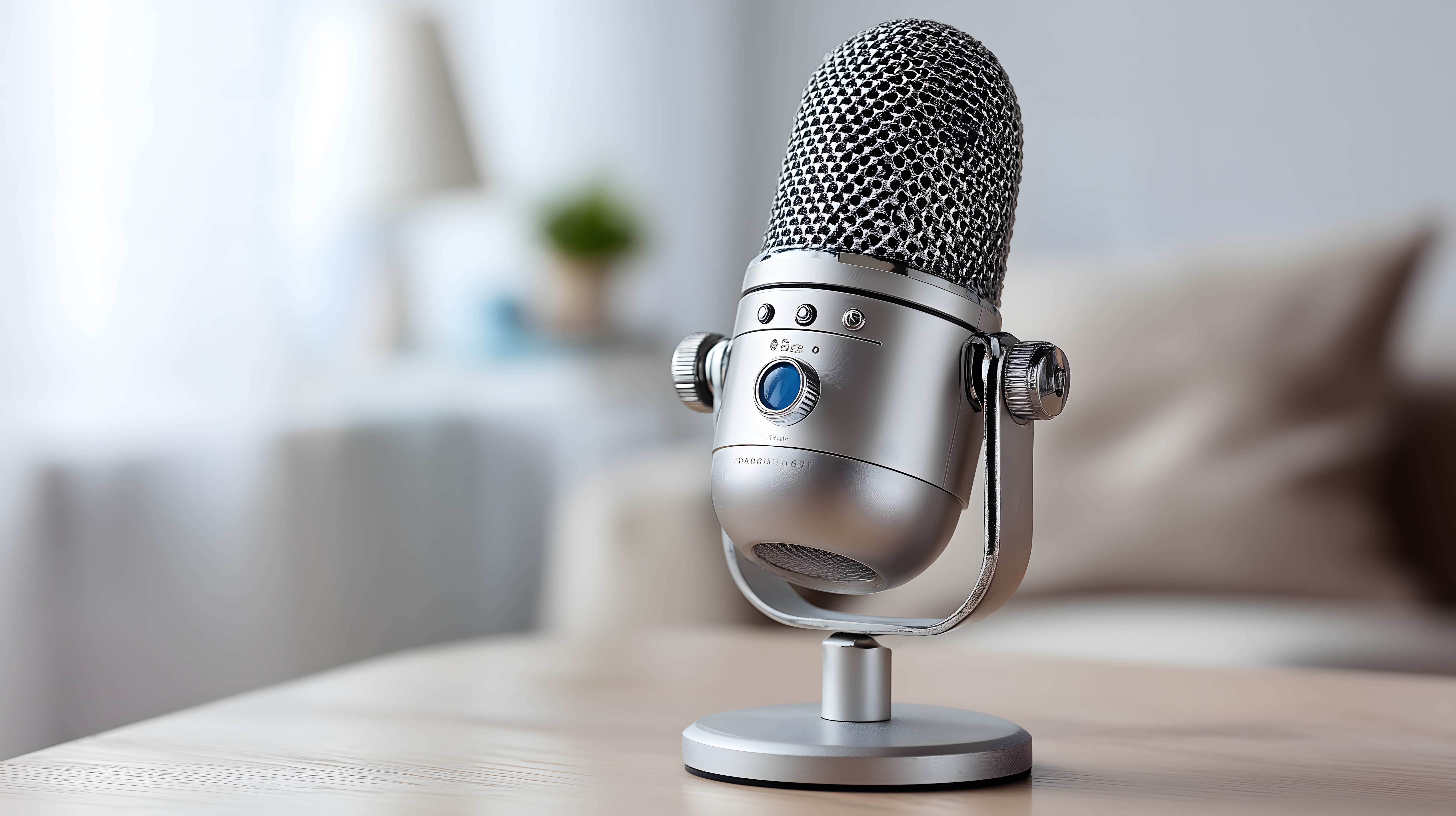 Das Bild zeigt ein hochmodernes Studiomikrofon in einem hellen, minimalistischen Ambiente. Das silberne, schallreflektierende Gehäuse des Mikrofons steht im Mittelpunkt der Aufnahme und ist von einem maschigen, schwarzen Windschutz umgeben. Das Mikrofon ist auf einem schlichten weißen Ständer platziert, der sich vor einem unscharfen Hintergrund mit leichten Akzenten in Grün und Blau befindet.