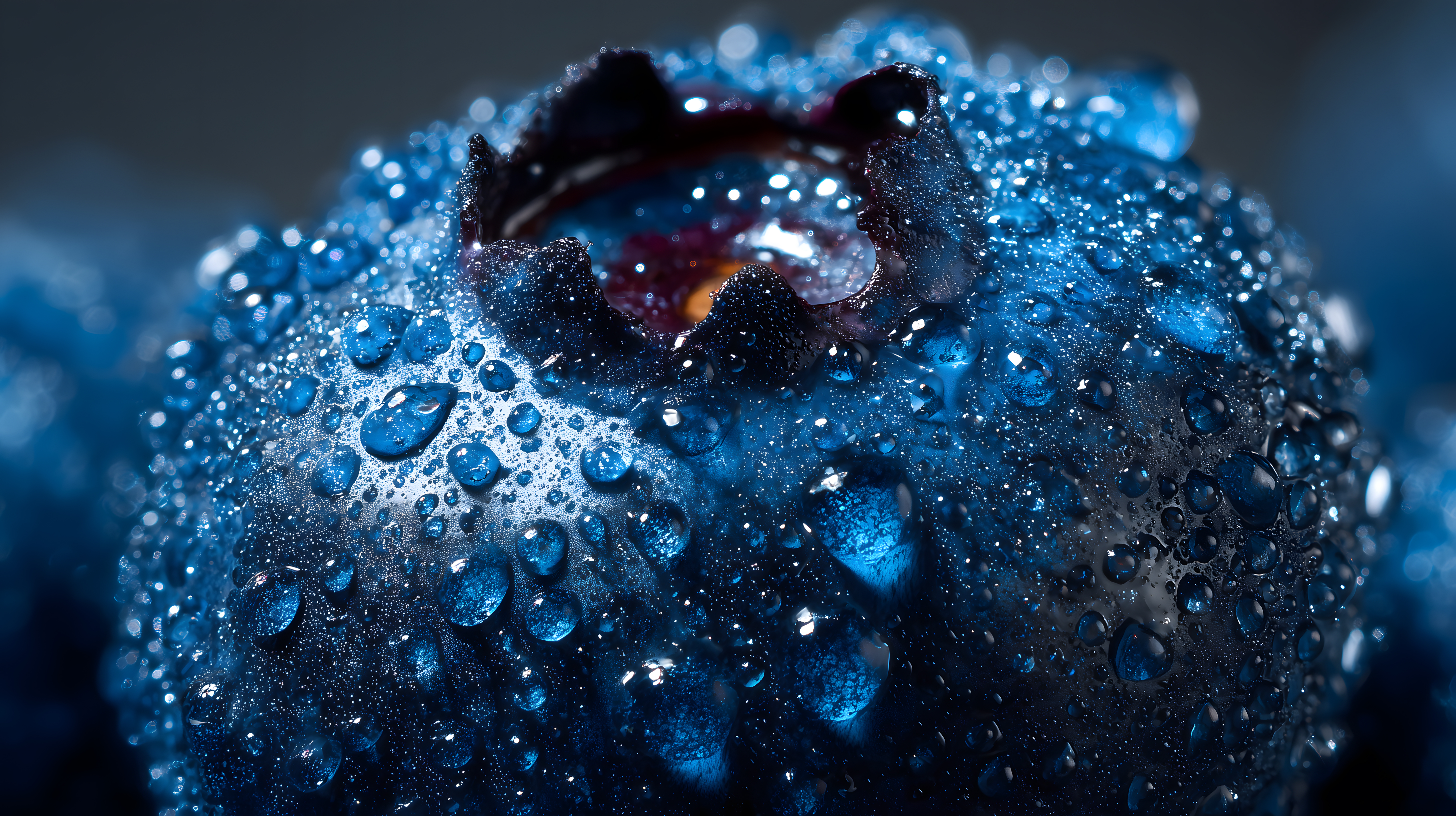 Das Bild zeigt eine nahaufnahme einer glitzernden, nassen Oberfläche in verschiedenen Blautönen. Die Tropfen und Verwischungen verleihen dem Foto eine abstrakte, fast surreale Optik. Die Komposition mit der Fokussierung auf die Farbwelt und die Strukturen erzeugen eine faszinierende, fast hypnotisierende Wirkung.