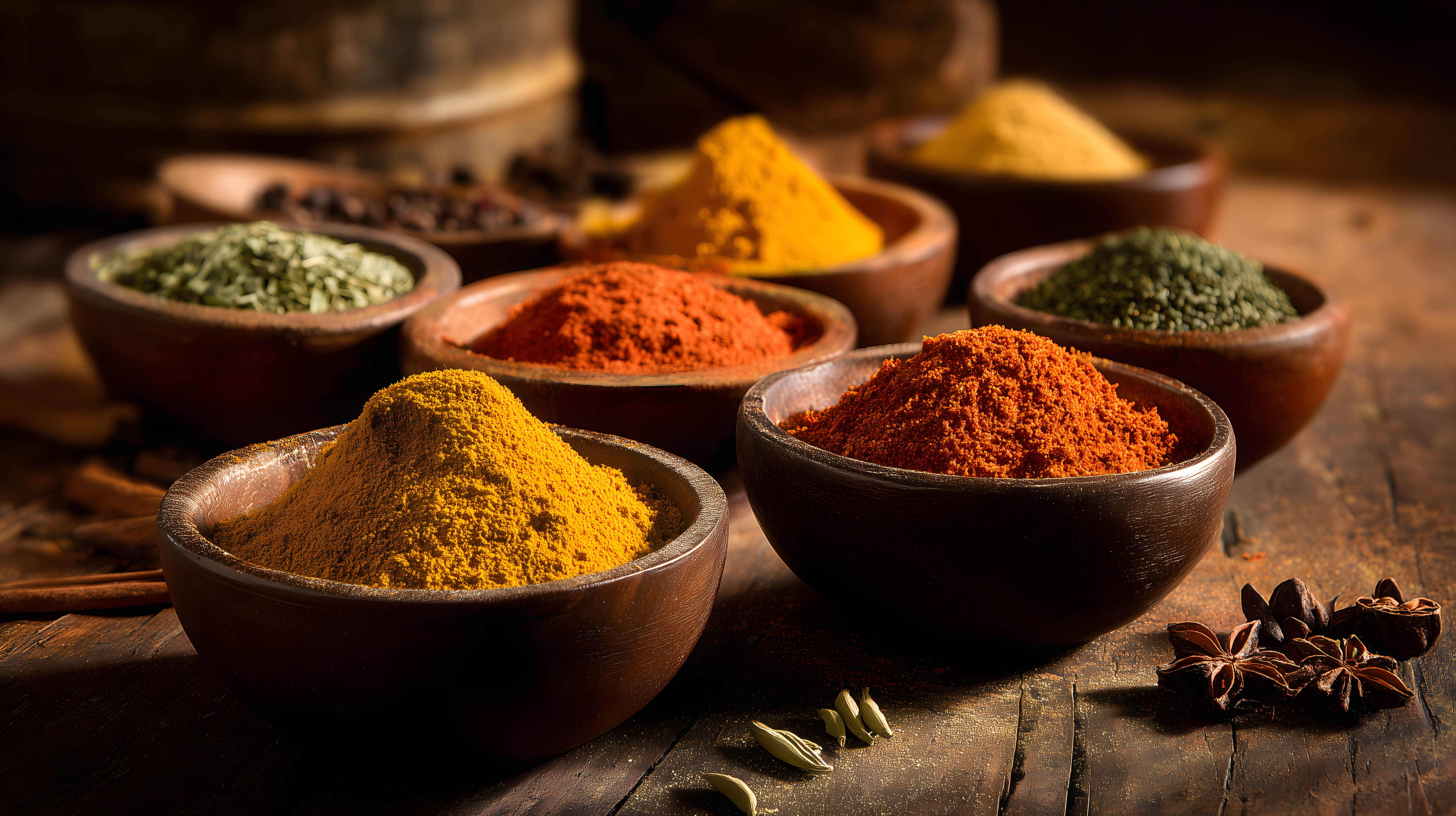 Das Bild zeigt eine Auswahl verschiedener Gewürze und Kräuter in einer rustikalen Holzoptik. Die Gewürze sind in kleinen Holzschalen angeordnet und umfassen eine Vielzahl an Farben, von kräftigem Rot über Gelb bis hin zu Grün. Die Draufsicht auf die Schalen verleiht dem Bild eine professionelle und detaillierte Optik, die perfekt für den Einsatz in Blogs, Newslettern, Social-Media-Kanälen oder Werbematerial geeignet ist.