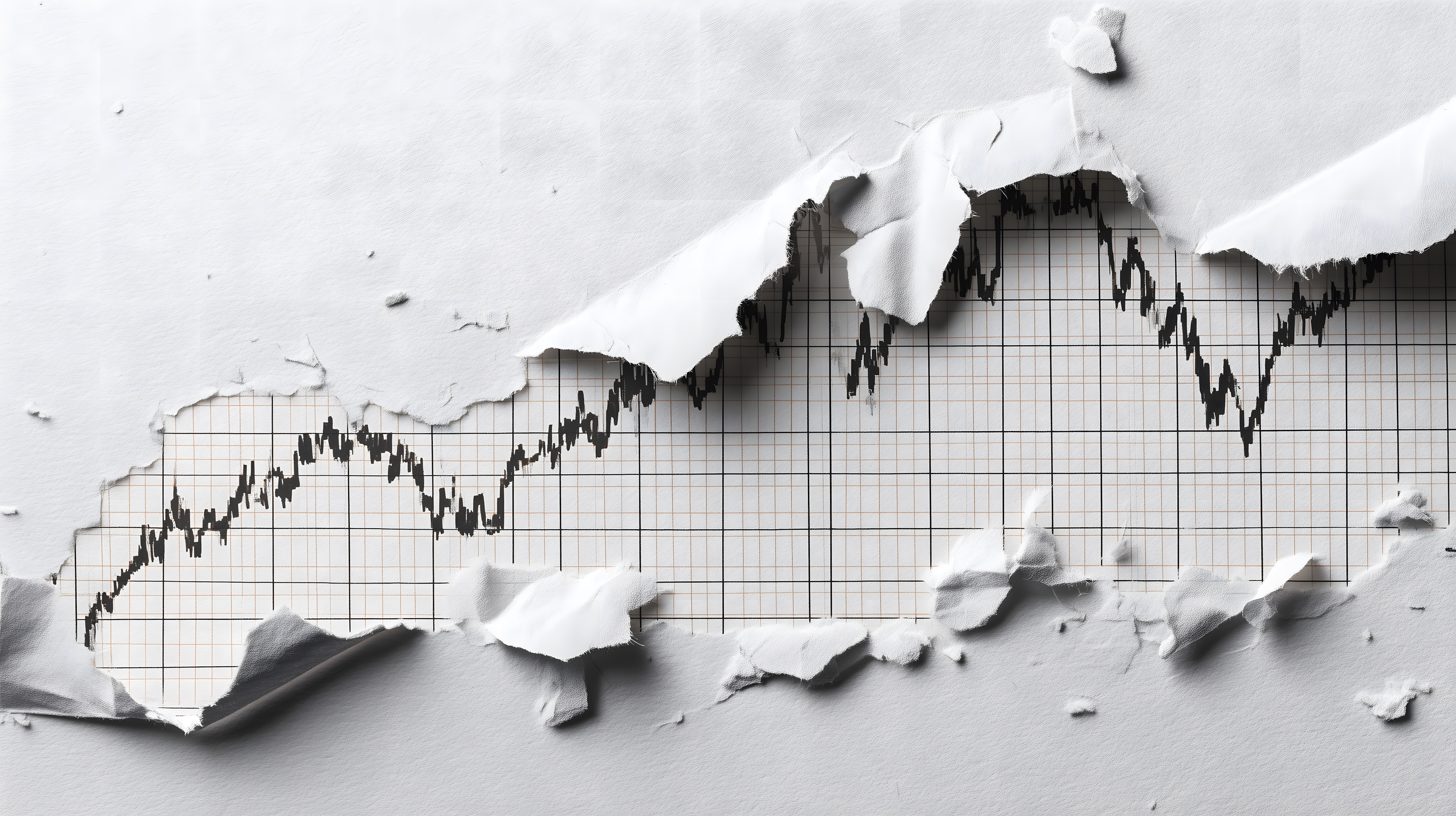 Das Bild zeigt einen zerrissenen Börsenkurs-Diagrammhintergrund in Schwarz-Weiß. Der Hintergrund ist mit einer Gitternetzstruktur versehen, die die Kursentwicklung darstellt, und es sind deutliche Risse und Löcher in der Papierstruktur zu sehen, die das Bild eine abstrakte, düstere Stimmung verleihen.