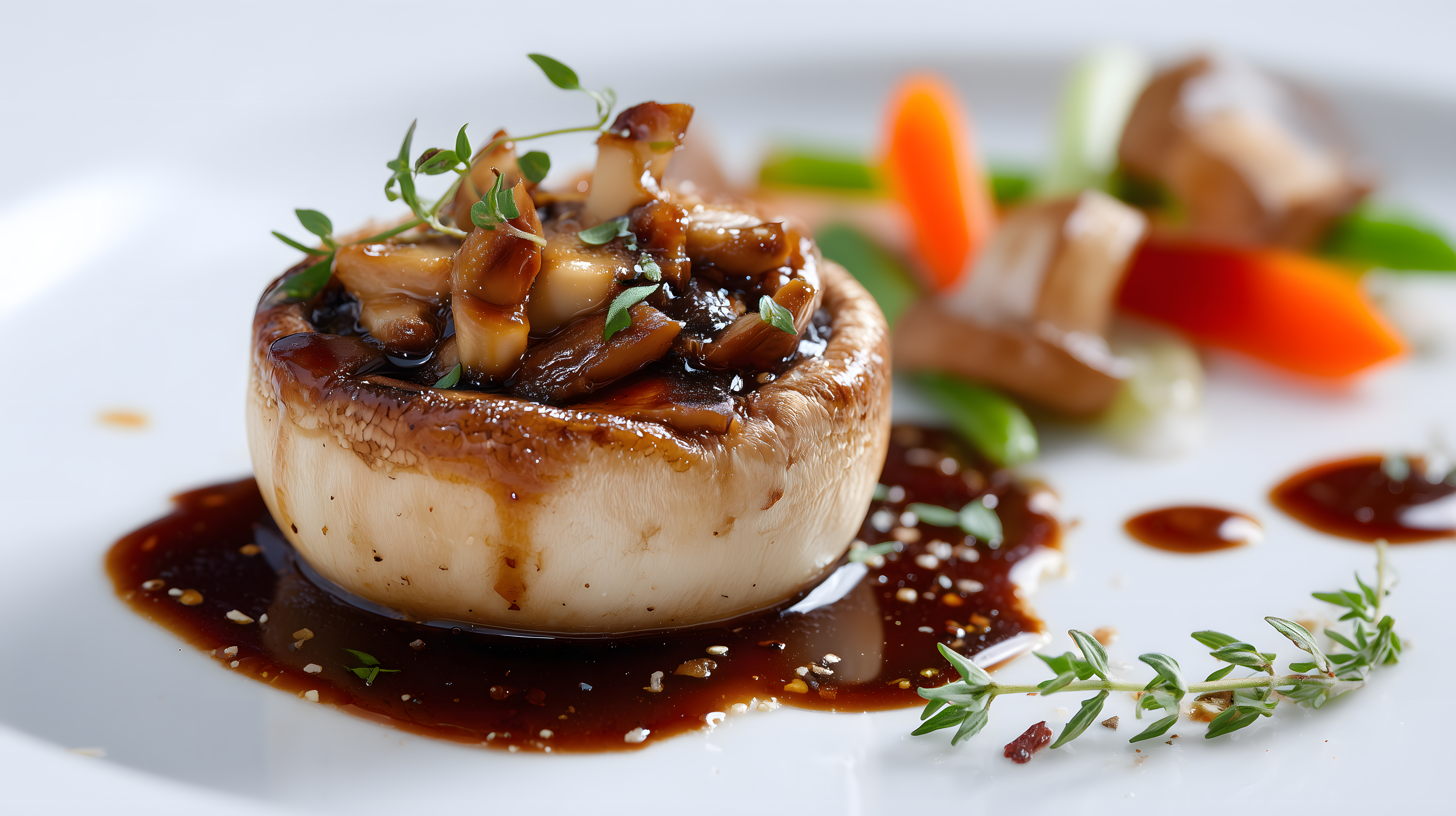 Das Foto zeigt eine appetitlich angerichtete Speise auf einem weißen Teller. Im Zentrum befindet sich ein großer, goldbraun gegarter Pilz, der mit einer dickflüssigen, glänzenden Soße garniert ist. Um den Pilz herum sind fein geschnittenes, frisches Gemüse wie Karotten, Sellerie und Kräuter angeordnet, die dem Gericht eine natürliche, lebendige Optik verleihen. Die Komposition ist ausgewogen und die Farbpalette reicht von Brauntönen über Grün- und Rottöne bis hin zu Akzenten von Orange.